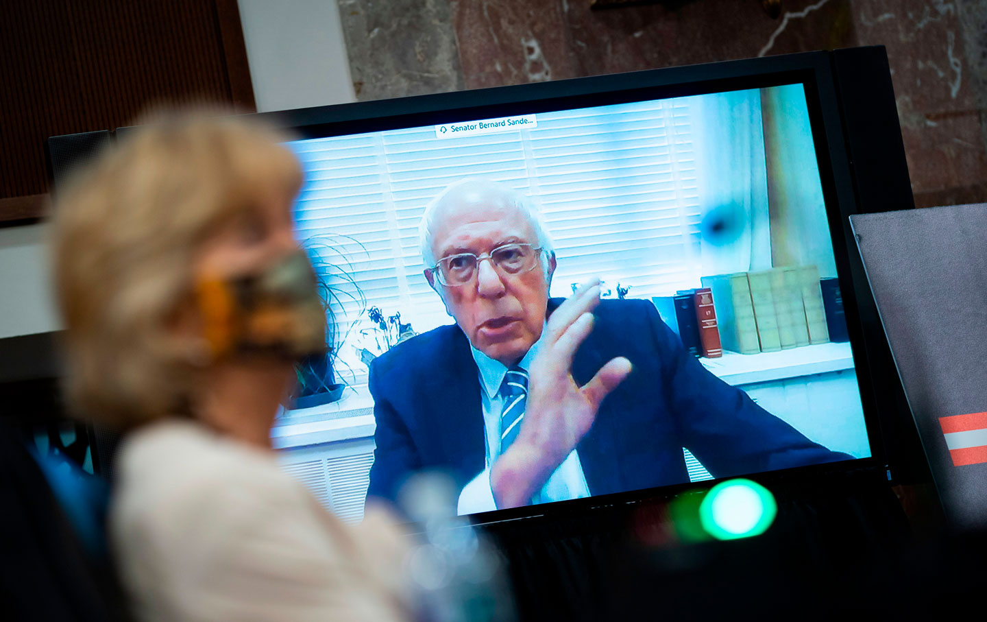 Senator Bernie Sanders speaks via teleconference during a Senate Health, Education, Labor and Pensions Committee hearing in June 2020.(Al Drago / AFP via Getty Images)