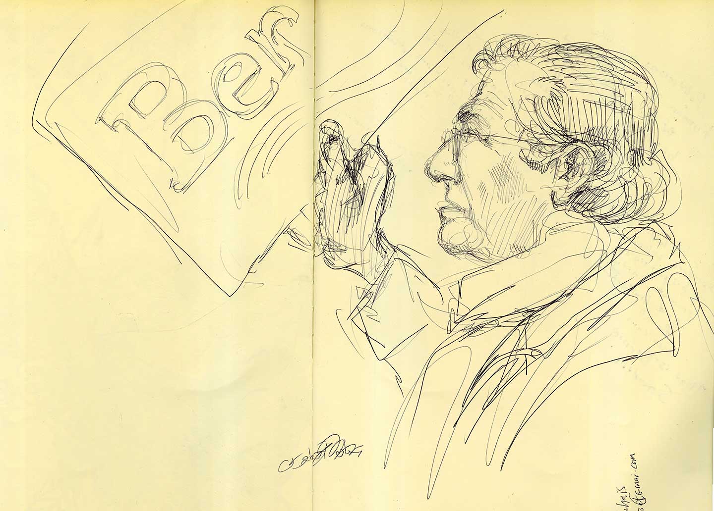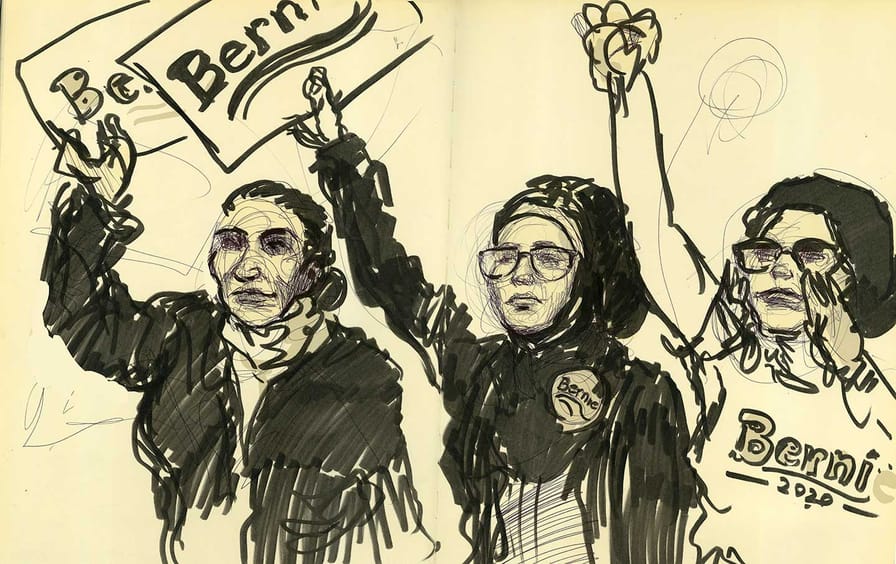 In between canvasing, I drew rallies. In Detroit, I tried to capture the young hijabi women who shouted, fists up, when Bernie told the audience that Joe Biden had supported the Hyde Amendment. My pen wasn’t quick enough to catch the now internet famous Palestinian dabke dancers who opened up the event in Dearborn.