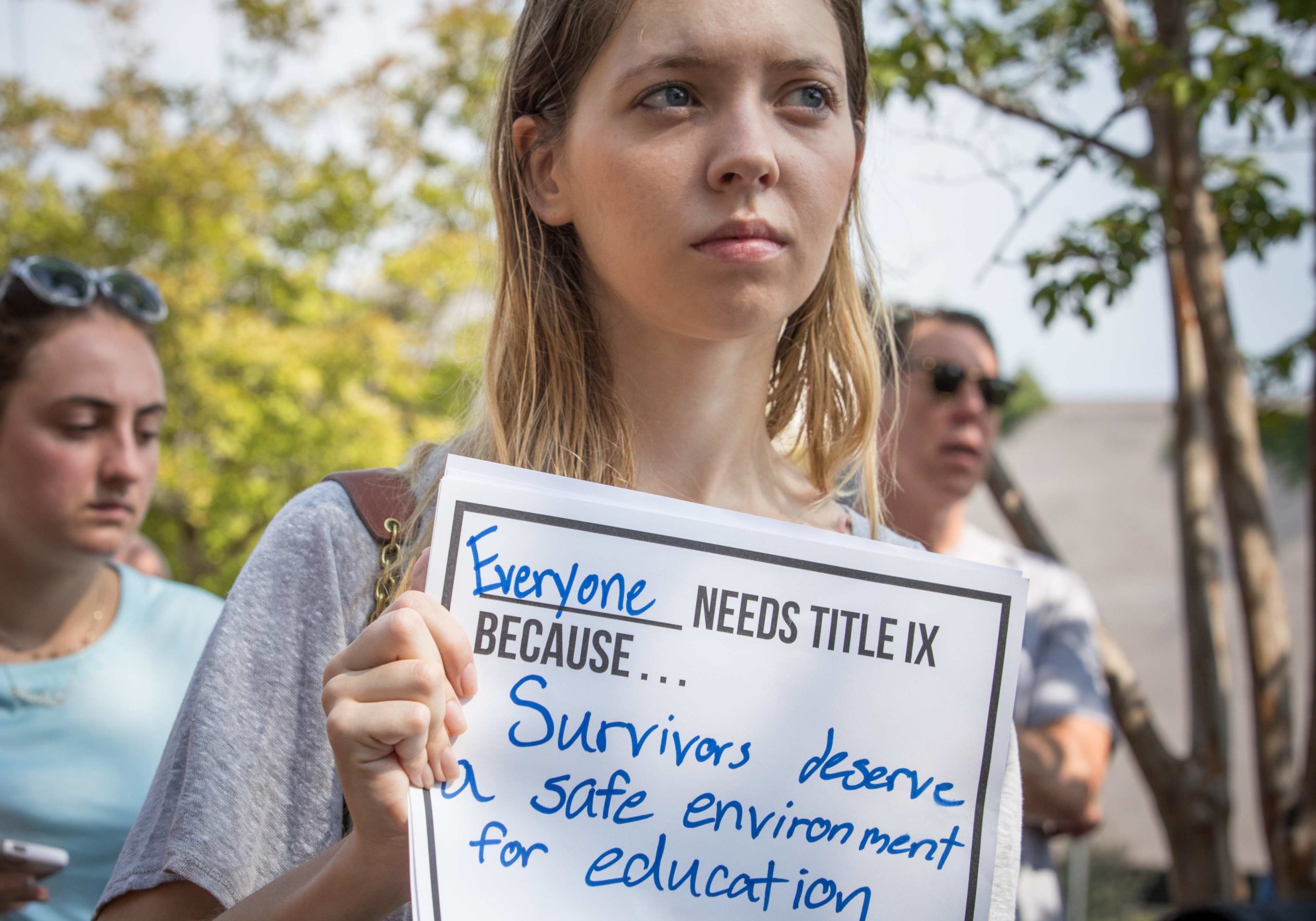In July 2017, Secretary of Education Betsy DeVos held a summit on Title IX, the 1972 federal statute that bans discrimination on the basis of sex at universities. Inside the Department of Education building, she met with the National Coalition for Men Carolinas (NCFMC), Families Advocating for Campus Equality (FACE), and Stop Abusive and Violent Environments (SAVE), three organizations that claim there is a crisis of false rape allegations against male college students. Outside, despite the sweltering heat in Washington, D.C., more than a 100 people rallied, hoping to prevent the department from rolling back protections for students who are victims of rape, sexual assault, and sexual harassment. “Dear Betsy,” one sign read. “Help end rape culture, don’t perpetuate it.”