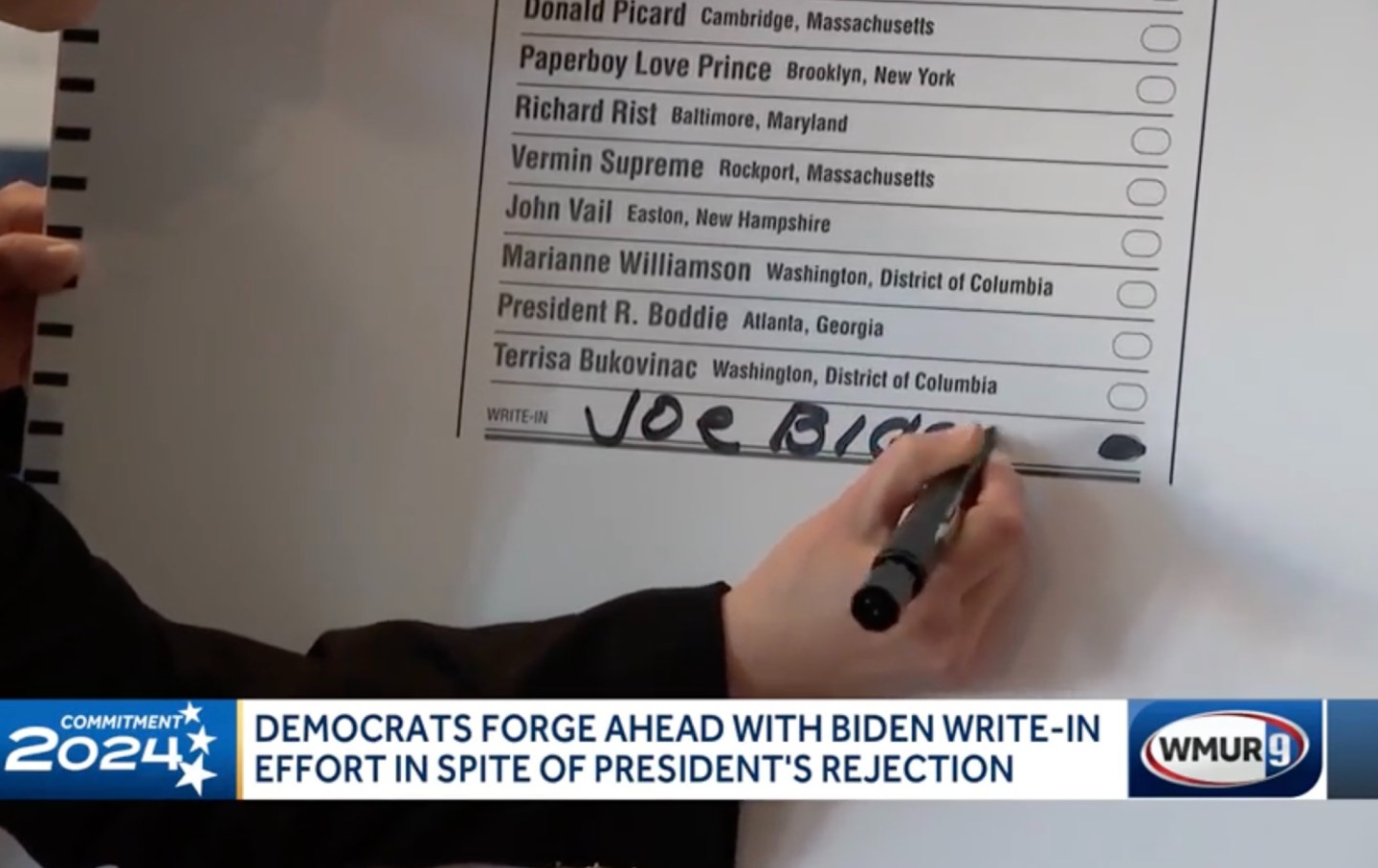 A demonstration of how to write in Joe Biden on the New Hampshire election ballot.