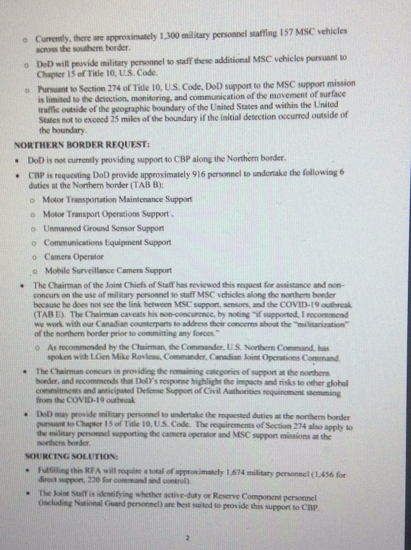 “The Chairman of the Joint Chiefs of Staff has reviewed this request for assistance and non-concurs on the use of military personnel to staff MSC [Mobile Surveillance Camera] vehicles along the northern border because he does not see the link between MSC support, sensors, and the COVID-19 outbreak,” the memo states. “The Chairman caveats his non-concurrence, by noting ‘if supported, I recommend we work with our Canadian counterparts to address their concerns about the “militarization” of the northern border prior to committing any forces.’”