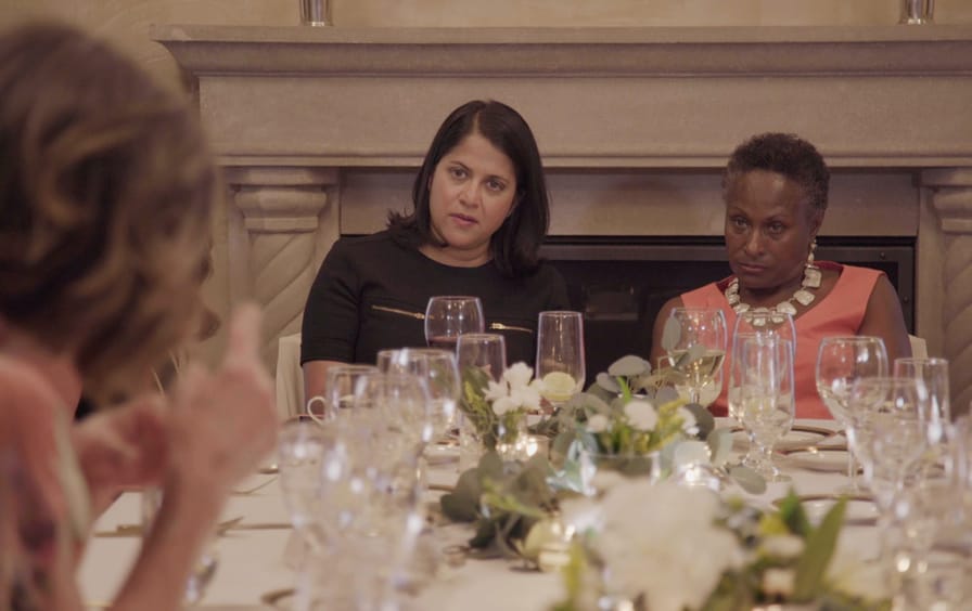 But first, it sits us down to a delightful meal, with red and white wine, at an elegantly appointed table in a gorgeous home near Denver. The film features one dinner hosted by Race2Dinner, a group led by Rao and her political partner Regina Jackson. Rao, who is of Indian descent, and Jackson who is Black, have created a project that tries to bring white women together, along with the pair of color, to have “radically honest conversations,” in Jackson’s words, about white women’s racism, whether conscious, unconscious or fervently denied (we see all three over this dinner, whose participants agreed to be filmed for broadcast).