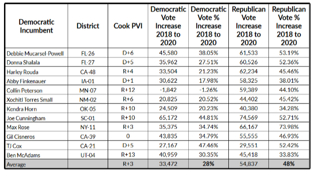 None of the Democratic incumbents who lost their seats lost many, if any, votes from the 2018 totals that put them in office in the first place. On average, the number of votes for Democrats in those districts increased by 33,000. The number of Republican votes, however, increased by an average of 55,000.