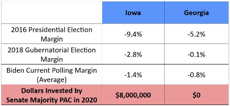 Despite this clear road map revealed by the underlying data, the largest Democratic super PAC, Senate Majority PAC, had invested $0 in winning Georgia as of August 1, while plowing $8 million into the contest in Iowa (in September, Senate Majority PAC did begin making some investments in one of the Georgia races). The following table comparing the respective states shows how the Iowa investment—and the Georgia omission—are completely unsupported by the underlying data.