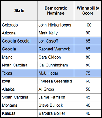 In terms of specific states this fall, Arizona and Colorado are the most likely Senate seats to flip, and the Democratic nominees in those states—former astronaut Mark Kelly and former Colorado Governor John Hickenlooper—hold sizable leads in all of the polling averages. Picking up the next two seats is where the challenge lies for Democrats. Nine additional seats are in play, and all of them are worthy of support and attention. For particular focus in the final weeks, investments in Georgia and Texas make the most sense at this point in the race.