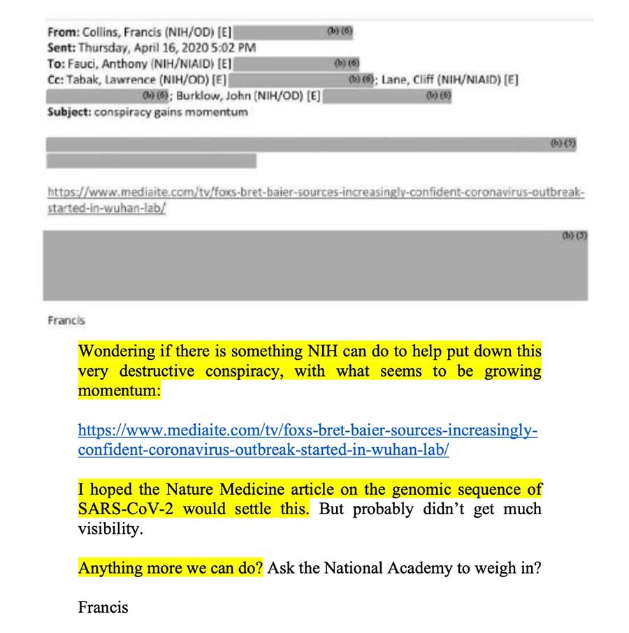 According to redacted e-mails obtained, transcribed and released by Republicans on the House Oversight and Reform Committee last year, Francis Collins wrote the following to Fauci and other NIH staff the month after the Proximal Origin paper was published: