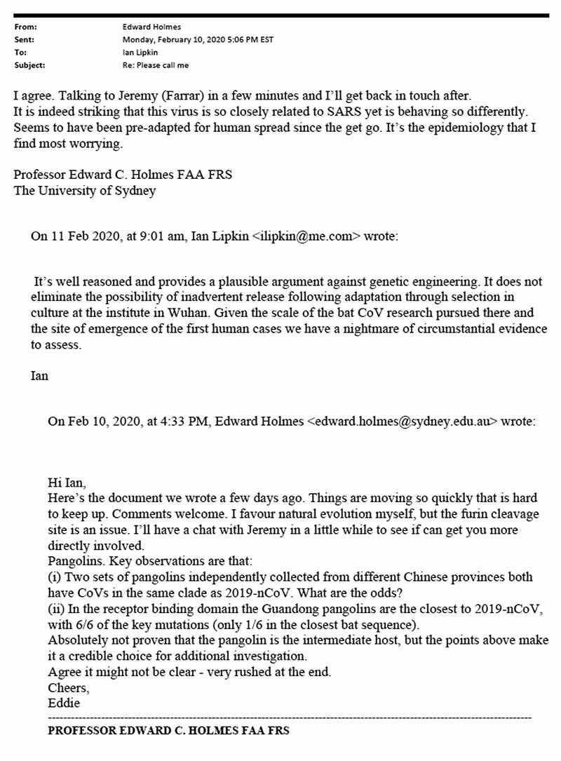 The Proximal Origin paper’s production, publication, and influence remain the subject of heated controversy in the debate about Covid’s origin, a debate that became particularly politicized after President Trump claimed publicly in late April 2020 that his administration had evidence that Covid-19 came from a Chinese lab. Some have said that the paper’s ultimate conclusions reflect nothing more or less than the scientific process at work. “I’ve absolutely no problem with people knowing that my views on this issue have evolved as more data have appeared. That’s science,” wrote one of the paper’s authors, Eddie Holmes of the University of Sydney, in an e-mail obtained via FOIA. “Indeed, I’ve told this to many people: the way see [sic] it is that we set-up an hypothesis and then tested it. As far I [sic] can tell we are only ‘guilty’ of following the proper scientific method.”