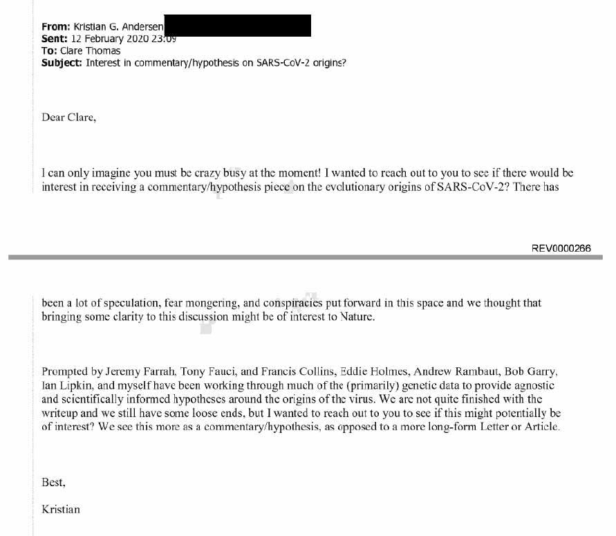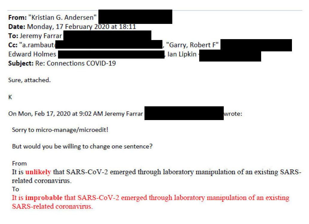 They show that on February 12, 2020, Dr. Kristian Andersen, a professor at Scripps Research and a key author of the Proximal Origin paper, sent an e-mail to an editor at the journal Nature to gauge her interest in publishing the paper. He noted in the e-mail that he and his co-authors had been “prompted” in their efforts by Fauci, Collins, and Jeremy Farrar, then the leader of a major UK research institution called the Wellcome Trust and a key organizer of the February 1 teleconference between the NIH officials and top scientists.