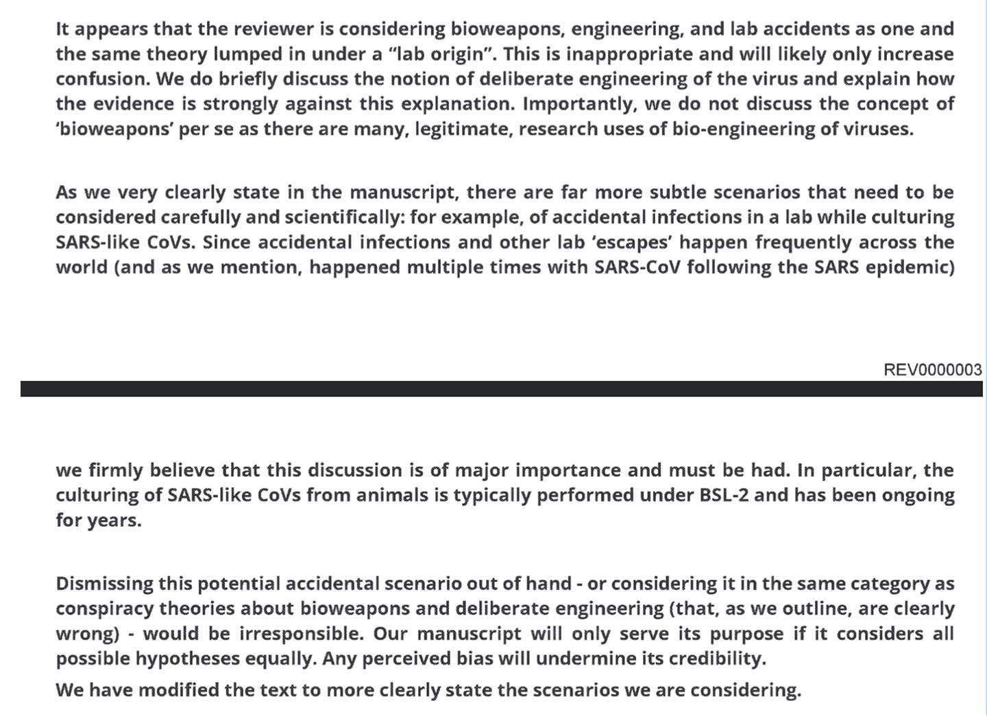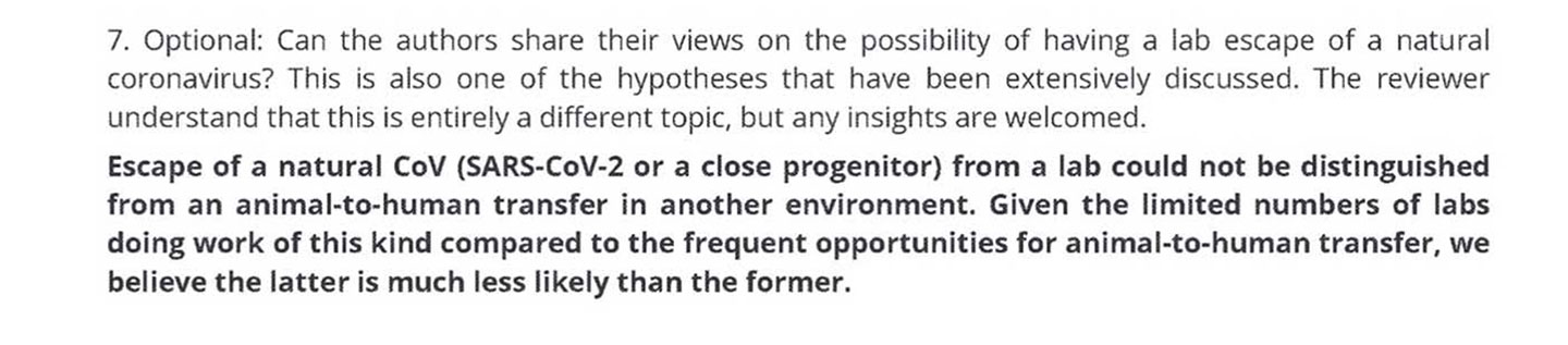 In response to a separate peer-reviewer, they also explained their general thinking about the possibility of a lab leak: