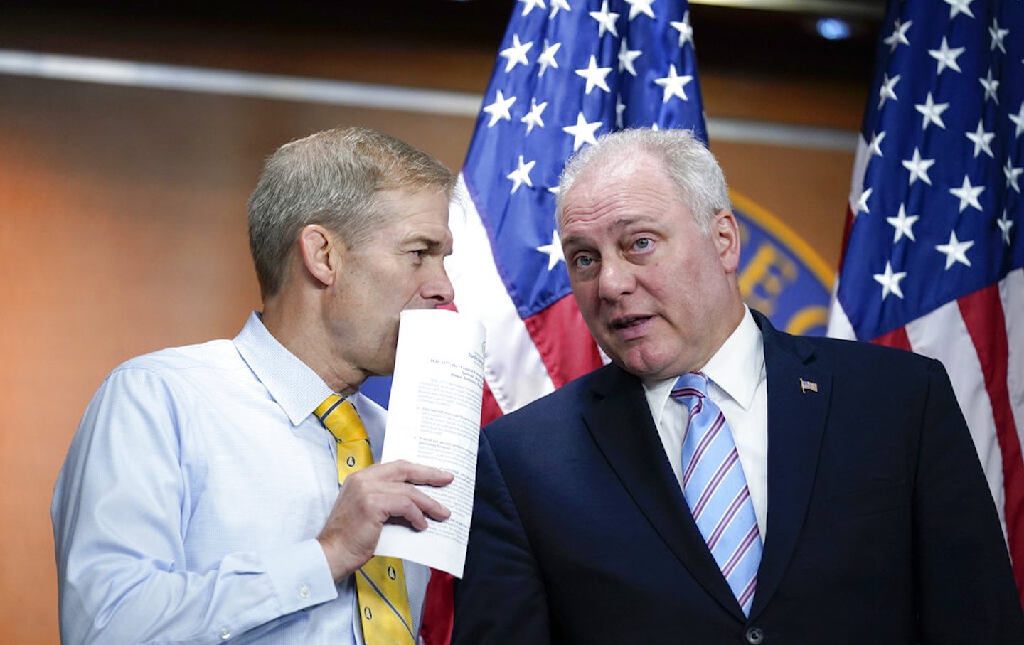 Representatives Jim Jordan (R-Ohio), left, and Steve Scalise (R-La.), confer during a news conference at the Capitol in Washington, Wednesday, June 8, 2022.