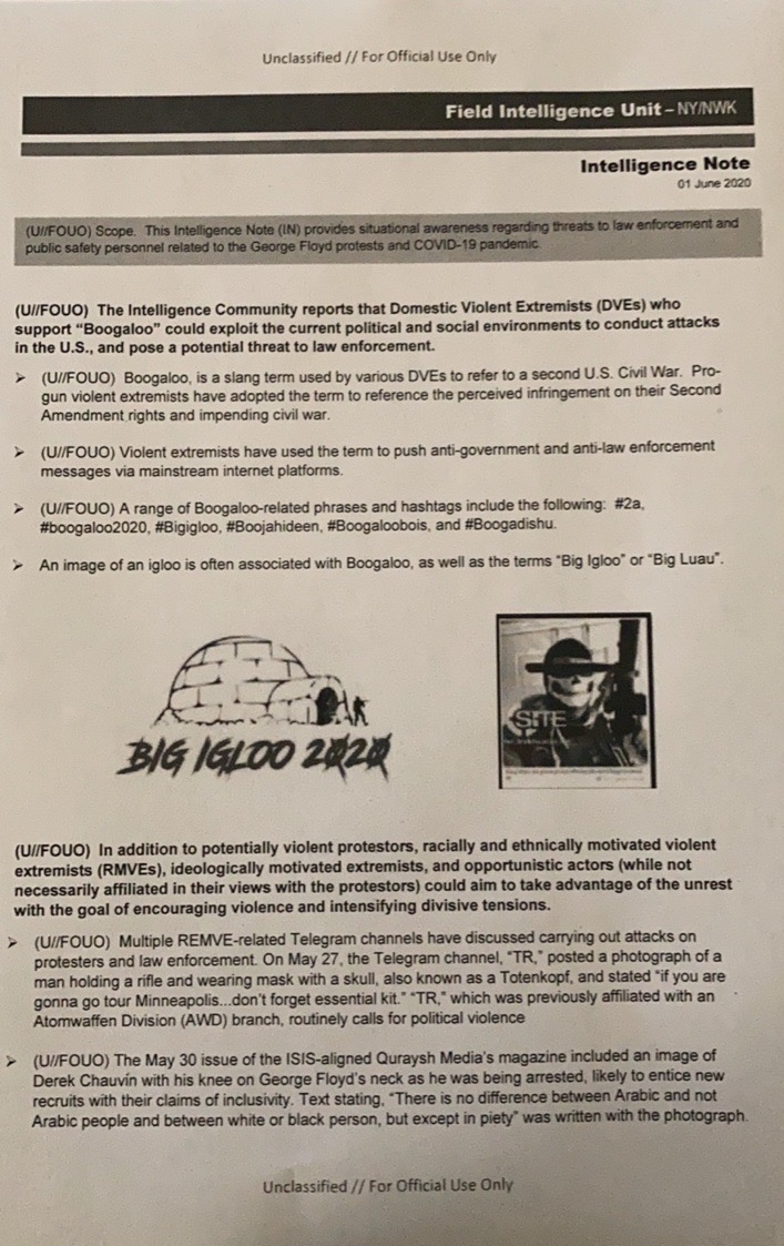 The intelligence report, dated June 1, 2020, and marked “For Official Use Only,” was provided by a federal law enforcement official on condition of anonymity to avoid professional reprisal. The DHS did not respond to a request for comment.