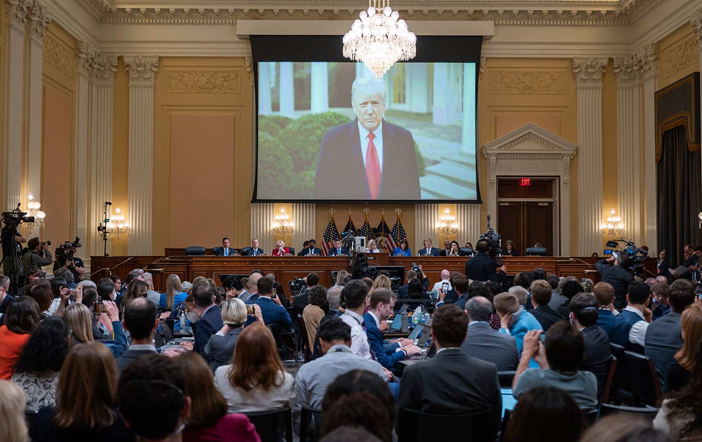 As for Trump, Thursday’s hearing detailed his inaction—and even worse, his encouragement—during the three-plus hours when thousands of rioters stormed the Capitol, brutalized police, and called for violence against Pence and Democratic members of Congress. Two White House staffers testified that they resigned when, rather than call off the mob, Trump tweeted mid-afternoon that Pence “didn’t have the courage to do what should have been done to protect our Country and our Constitution.” In the words of one, that was “pouring fuel on the fire”; indeed, the committee showed Pence and his family being whisked away from the mob just two minutes after Trump’s tweet.