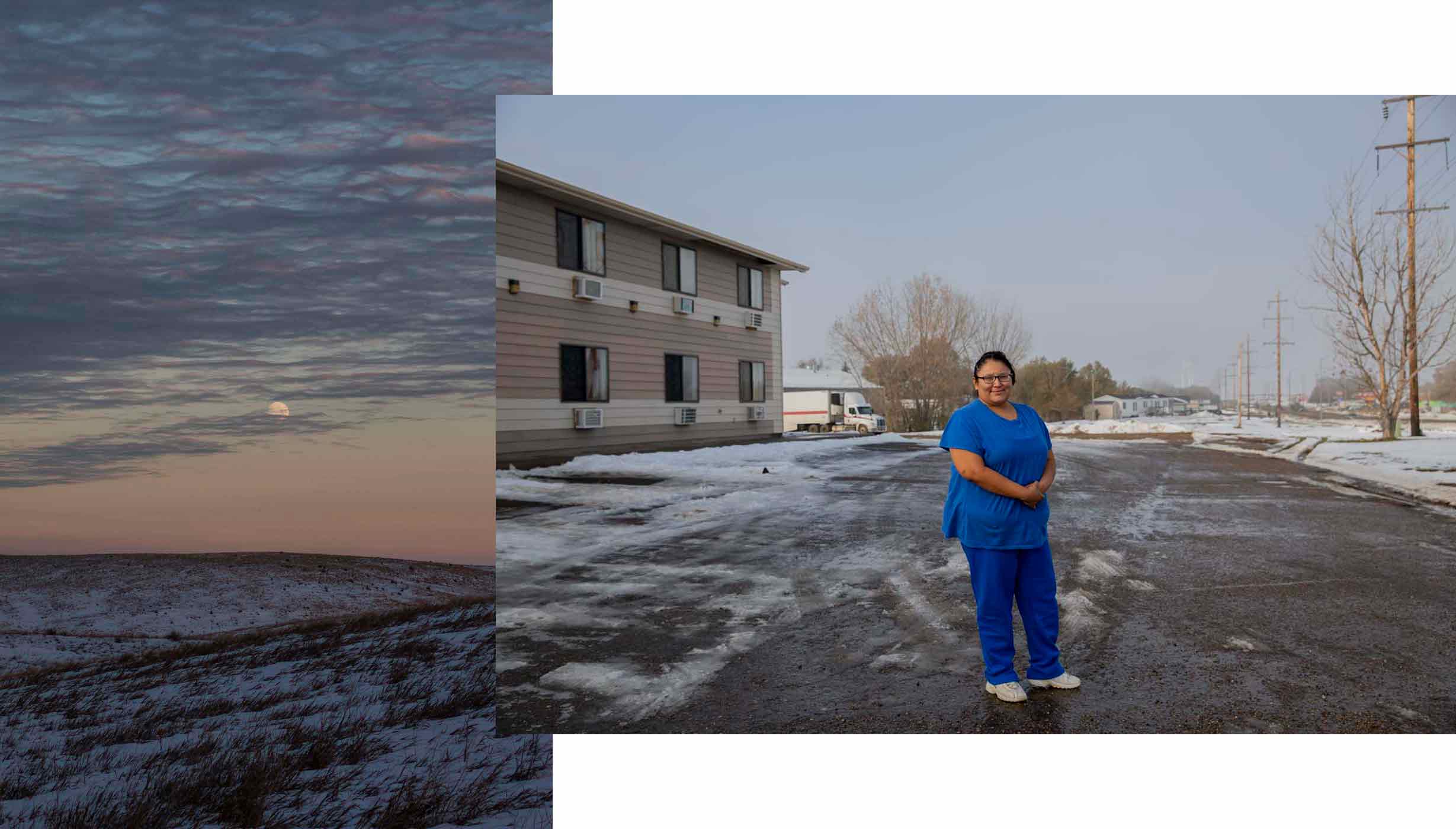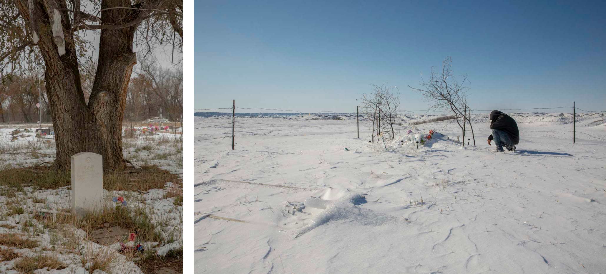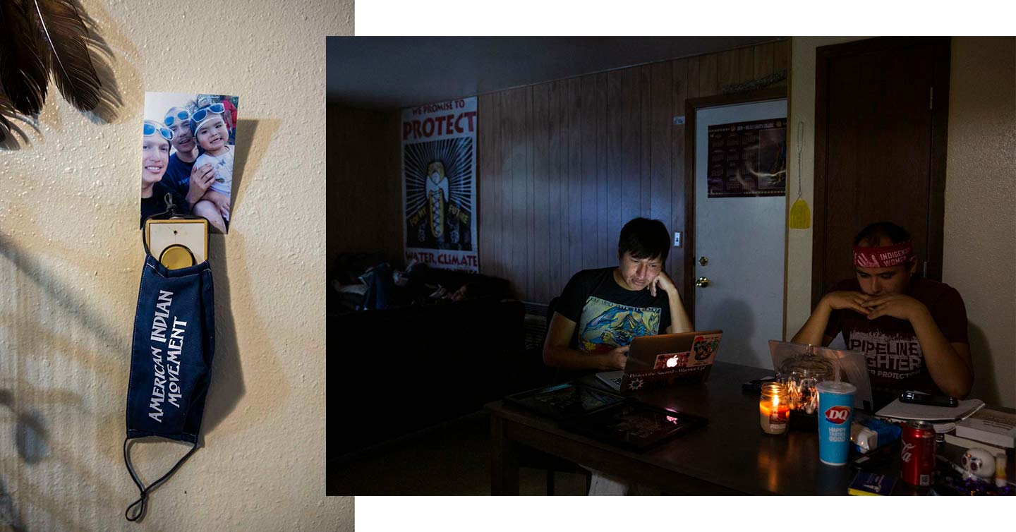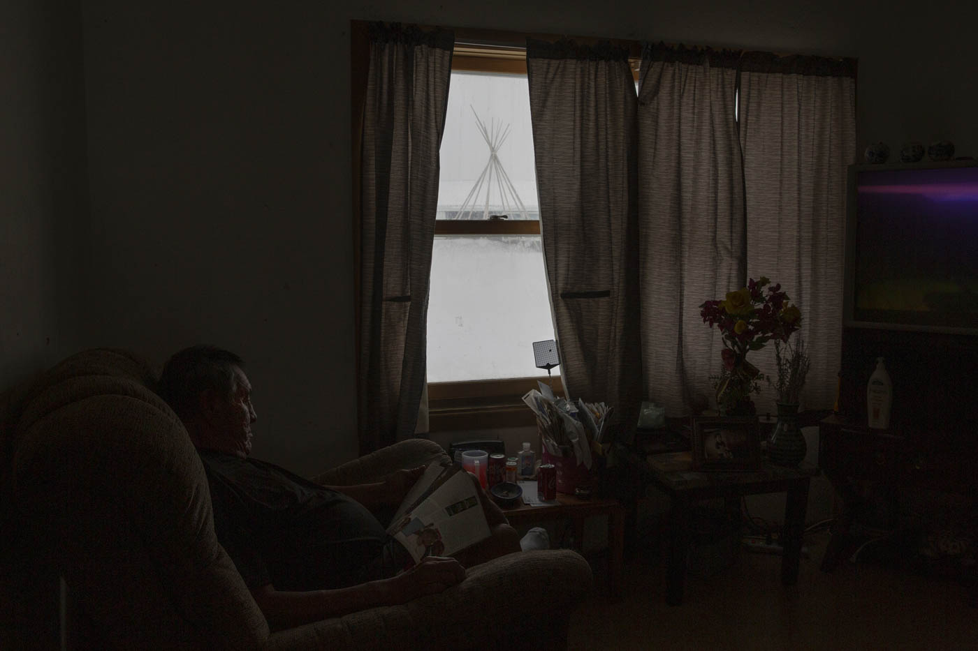 This wasn’t my first trip to Cheyenne River. I met activists Danny Grassrope and Joseph White Eyes in 2016 during the uprising against the Dakota Access Pipeline near the Standing Rock Reservation. I’ve visited Grassrope and White Eyes many times in the years since. They’ve introduced me to their families and friends, and shared their lives with me. This story wouldn’t have been possible without the doors they opened, their hospitality, and their trust. On this particular trip, White Eyes drove me to a remote checkpoint during a snowstorm—at night—then sat in the truck with me for over two hours while I scanned the darkness for headlights, waiting for cars to approach the barrier. Grassrope cooked dinners and together with White Eyes led me to Mona Grindstone, Tami Hale, and Joyce Edwards, three women who invited me into their homes and histories.