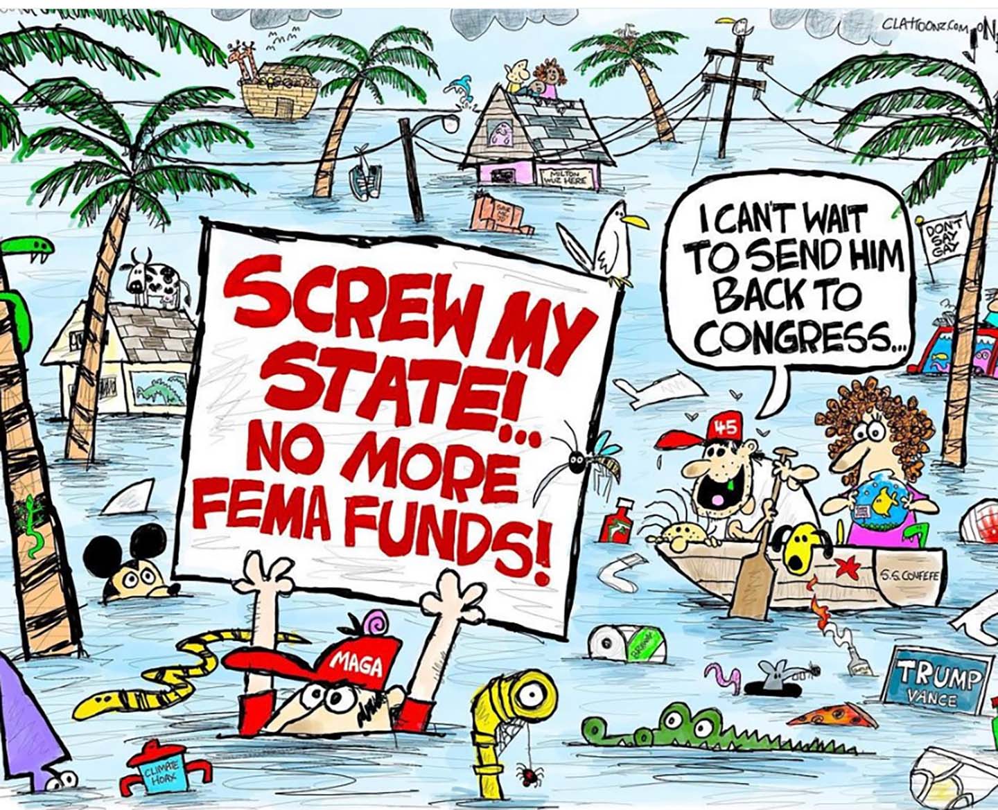 PoliticsOppArtOctober 23, 2024No More FEMA!No More FEMA!Screw us! Clay Jones Share Copy Link Facebook X (Twitter) Bluesky Pocket Email October 23, 2024 Check out all installments in the OppArt series. Keep Reading Ad Policy