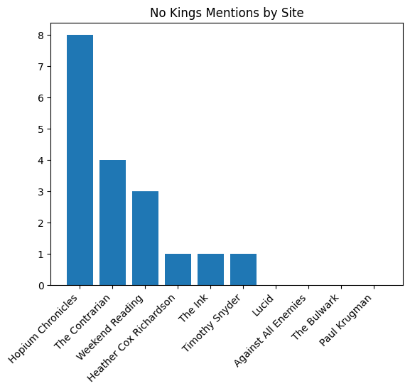 The second thing I did was much simpler: Focusing just on that core group of 10 sites/authors, I looked for mentions by them of “No Kings”—the name of the biggest pro-democracy push in the country—since the end of January, when the No Kings coalition announced that March 28 (this Saturday), would be the next day of mass national protest. What I found surprised me.