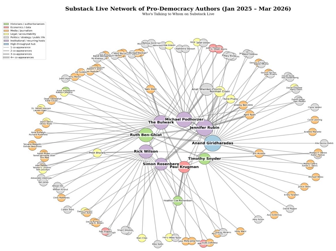 To make this a manageable project (meaning, something I could do in a day given what this Substack generates income-wise!), I decided to focus on two things. First, taking note of how often pro-democracy authors have been using Substack Live to attract and drive attention, I built a network analysis of “who is talking to whom.” I seeded the network with a list of some the most prominent sites and authors I’m familiar with: The Contrarian (which is led by Jennifer Rubin, formerly of the The Washington Post), The Bulwark, historians Timothy Snyder, Heather Cox Richardson, and Ruth Ben-Ghiat, economist Paul Krugman, political strategists Simon Rosenberg, Rick Wilson, and Michael Podhorzer, and author Anand Giridharadas. And then I went back a year, scraping each of their Substack sites to identify Substack Live guests, and then build a graph showing multiple co-appearances as stronger ties and individual appearances as weaker ones.