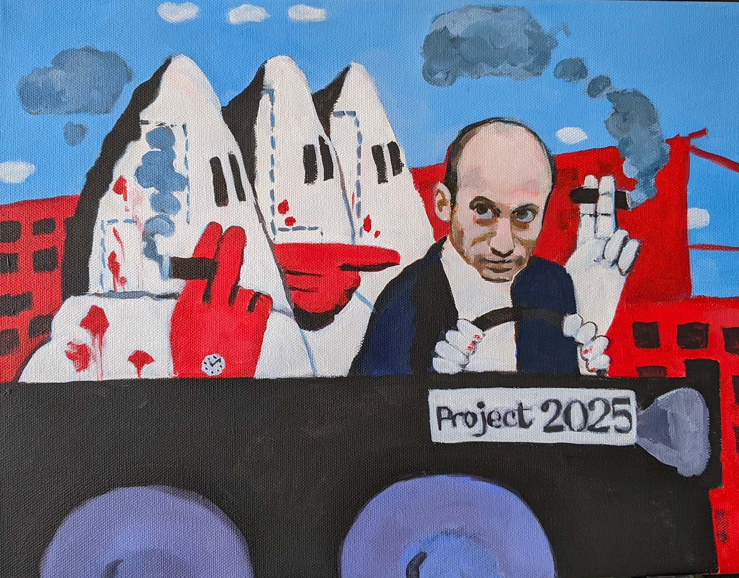 PoliticsOppArtAugust 15, 2024Project 2025, Going BackwardProject 2025, Going BackwardFormer Trump adviser Stephen Miller is trying to distance himself and his organization from Project 2025. (Painting inspired by Philip Guston’s KKK Paintings.) Colleen Quinn Share Copy Link Facebook X (Twitter) Bluesky Pocket Email August 15, 2024 Check out all installments in the OppArt series.