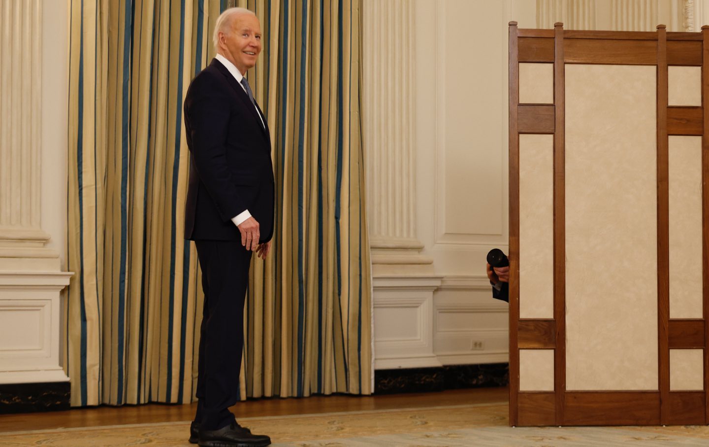 President Joe Biden pauses to react to a reporter’s question about Donald Trump’s claim that he’s a “political prisoner” at a recent press conference.(Chip Somodevilla / Getty Images)
