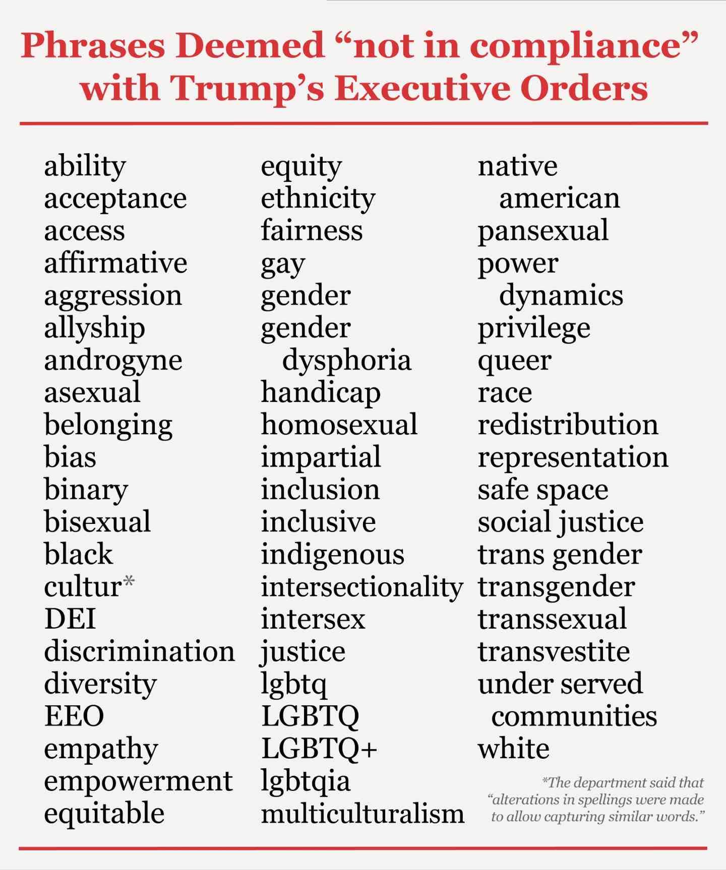 The administration’s crusade began well before Tuesday’s layoffs. In a February 5 e-mail, employees were directed to ensure compliance with some of Trump’s DEI- and gender-related orders. They included a list of keywords they say were unacceptable, including “fairness,” “access,” “empathy,” “homosexual,” “equity,” gender,” “LGBTQ,” “social justice,” and more.