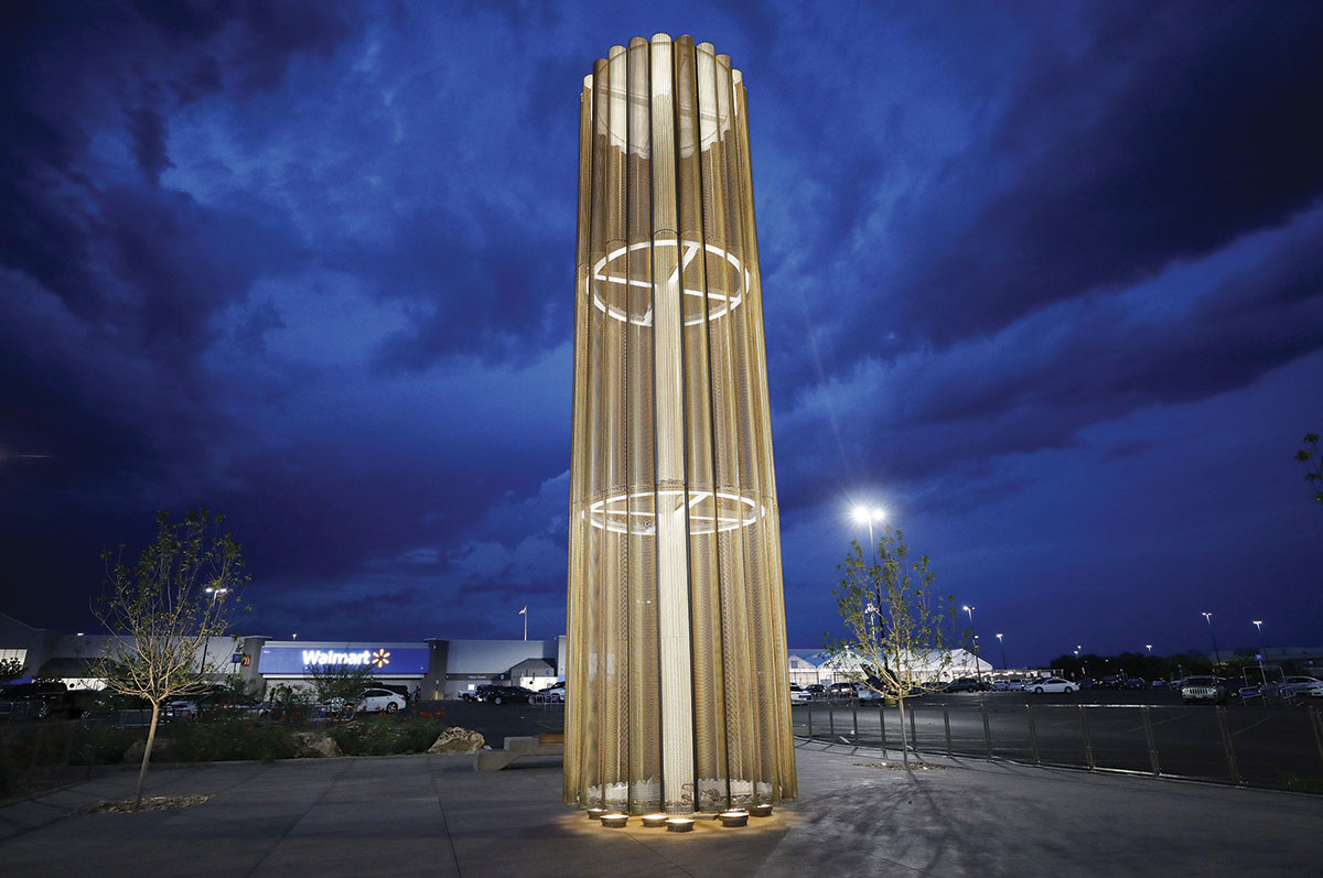 When the sun dips behind the Franklin Mountains and El Paso’s skies turn blood red, the Grand Candela memorial lights up the Cielo Vista Walmart parking lot. Completed in November 2019, the memorial consists of 22 metal panels, each representing a life lost in the mass shooting that took place on August 3, 2019 (a death toll that now stands at 23). Every panel of the 30-foot structure is beautifully perforated with different geometric shapes, stars and crescent moons. The memorial itself is emotionally powerful. But walking through the superstore, with its long lines and crowded aisles, you would never get the sense that this is hallowed ground. In a mall dominated by big-box stores, a Red Lobster, and a Hooters, the shoppers passing through the retail giant’s doors on the night we visited could have been anywhere in America.