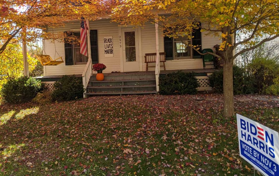About 45 minutes later, as we were wrapping up, a pickup truck sporting a huge Trump flag passed the house. The driver, seeing the yard signs and a couple of figures sitting outside, hurled an epithet in our direction as he gunned his truck and drove by.