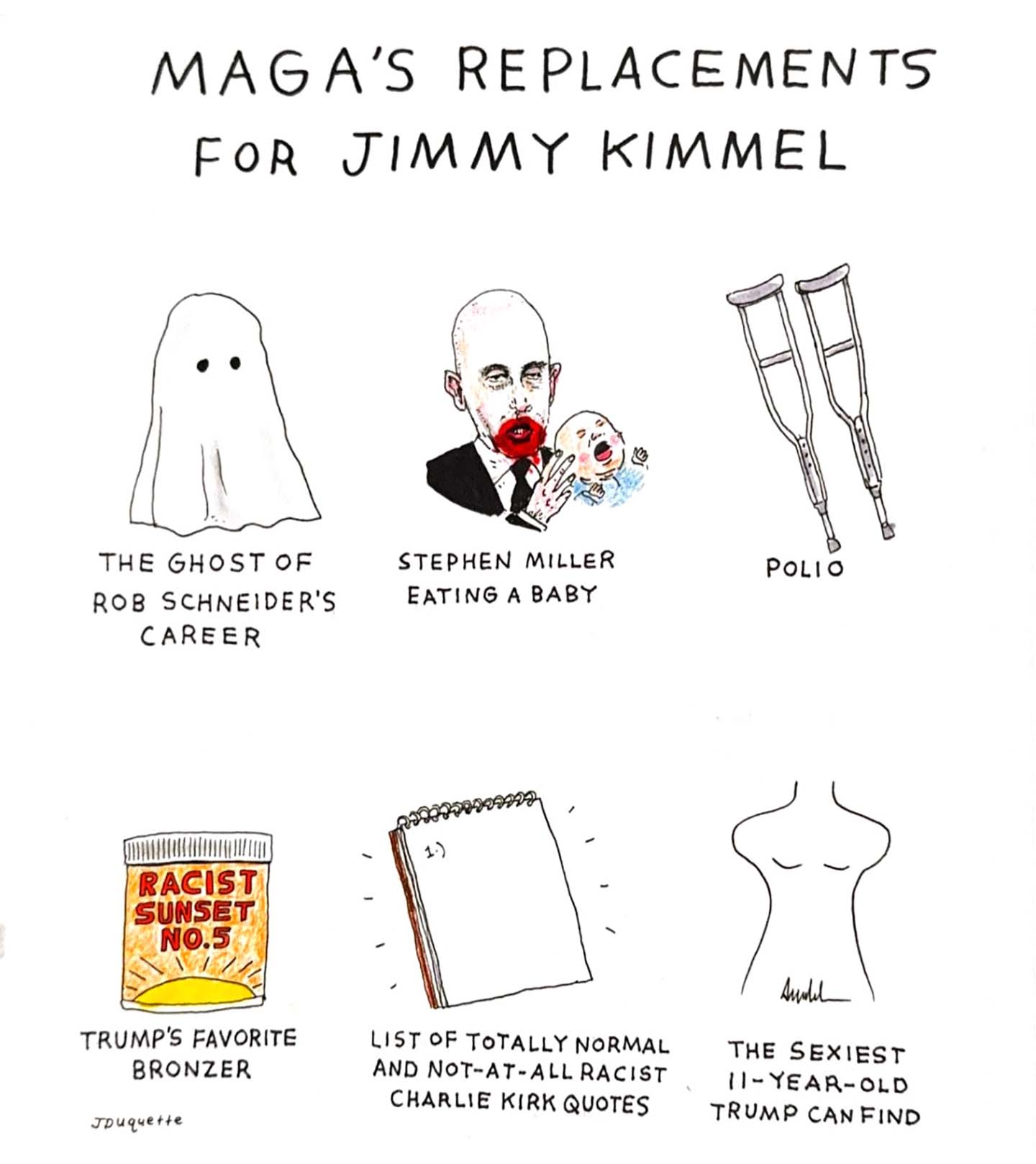PoliticsOppArtOctober 2, 2025What Could Replace Jimmy Kimmel?What Could Replace Jimmy Kimmel?Best guess? Jesse Duquette Share Copy Link Facebook X (Twitter) Bluesky Pocket Email October 2, 2025 (Jesse Duquette). Check out all installments in the OppArt series.