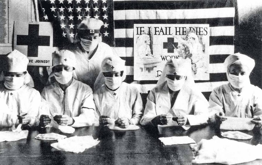 Public health precautions worked, but they were applied only patchily. In Manchester, England, the city’s chief medical officer managed to get the schools closed and the sick placed in lockdown, which was said to have saved many lives. He had been through a similar epidemic more than a quarter-century earlier and knew what to do. In Washington, D.C., too, the schools, theaters, pool halls, and bars were closed, and the Red Cross issued face masks. Advertisements called on Washingtonians to “Obey the laws / And wear the gauze / Protect your jaws / From septic paws.” Wrote one young man, looking back on these events: