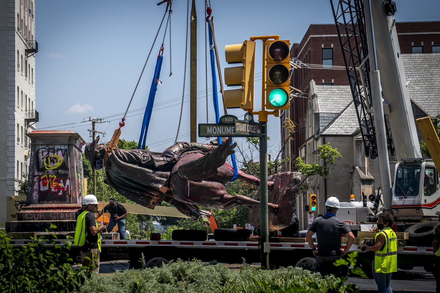 After activists took it upon themselves to remove some of the smaller statues commemorating anti-black violence and settler colonialism (including a bust of Christopher Columbus, which was dragged into a lake), the city has been systematically removing the remaining statues. This week I joined hundreds of onlookers to witness the removal of the Confederate Soldiers and Sailors Statue and one of the last Confederate statues left on Monument Avenue, that of Stuart. Now only the 14-foot-tall bronze sculpture of Lee on horseback remains. The process of removing Lee is being held up in court by a descendant of the couple who signed a deed giving the monument’s land to the State of Virginia, yet everyone from the mayor of Richmond to the governor of Virginia have called for its removal.