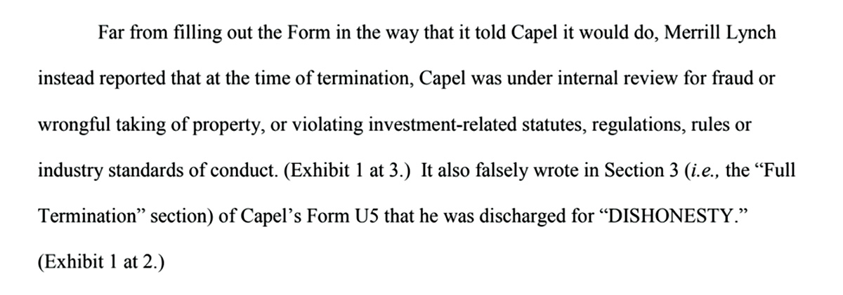 A month after Capel was dismissed, Merrill sent a document to securities regulators that said he had been terminated for—in all caps—“DISHONESTY.”