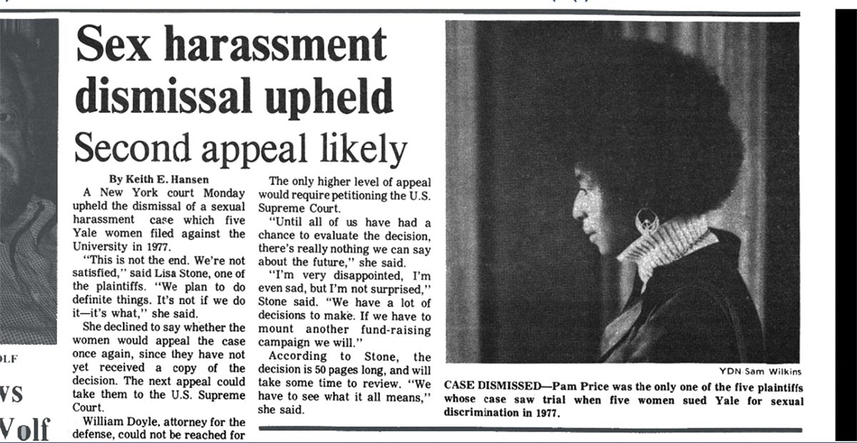 Judge Burns announced her decision on July 2, 1979: There was no proof that the alleged proposition by Duvall happened; the C grade was deserved; and because Price had already graduated, Yale’s policies no longer affected her. “It’s the same old story,” Price said in a statement. “Where sex is concerned, black women’s accusations are considered lies and white men’s denials are believed. Unfortunately, the trial, which was presided over by a woman, was merely another manifestation of the racism and sexism pervasive in society and reflected in its laws.”