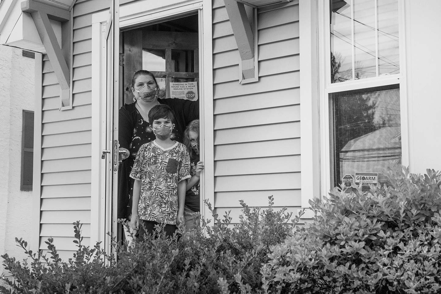 Poised with her two children on her three-step concrete porch, Heather struck a tone of defiant gratitude in regard to her months-long lockdown. Heather suffers from a host of chronic maladies, including immune thrombocytopenia, a serious risk factor possibly leading to increased mortality with the coronavirus. As such, she hasn’t risked venturing into public since March. “I don’t want to not be there for them,” she said, patting both her two children on their heads. The three wore blue N-95 masks cinched tightly over their faces.
