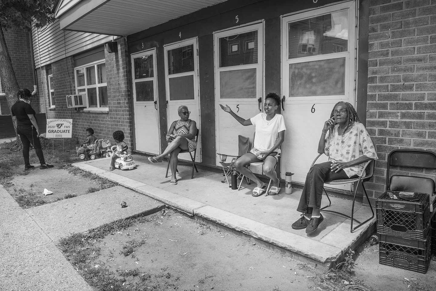 As we were talking, Frances returned and sat down in a narrow folding chair in front of her apartment door, hugging the shade. She had just delivered about 20 school lunches to children of parents she cared for over the past 42 years as a daycare provider. And now, she “delivers lunches, news, and humor to the projects,” as she calls them.