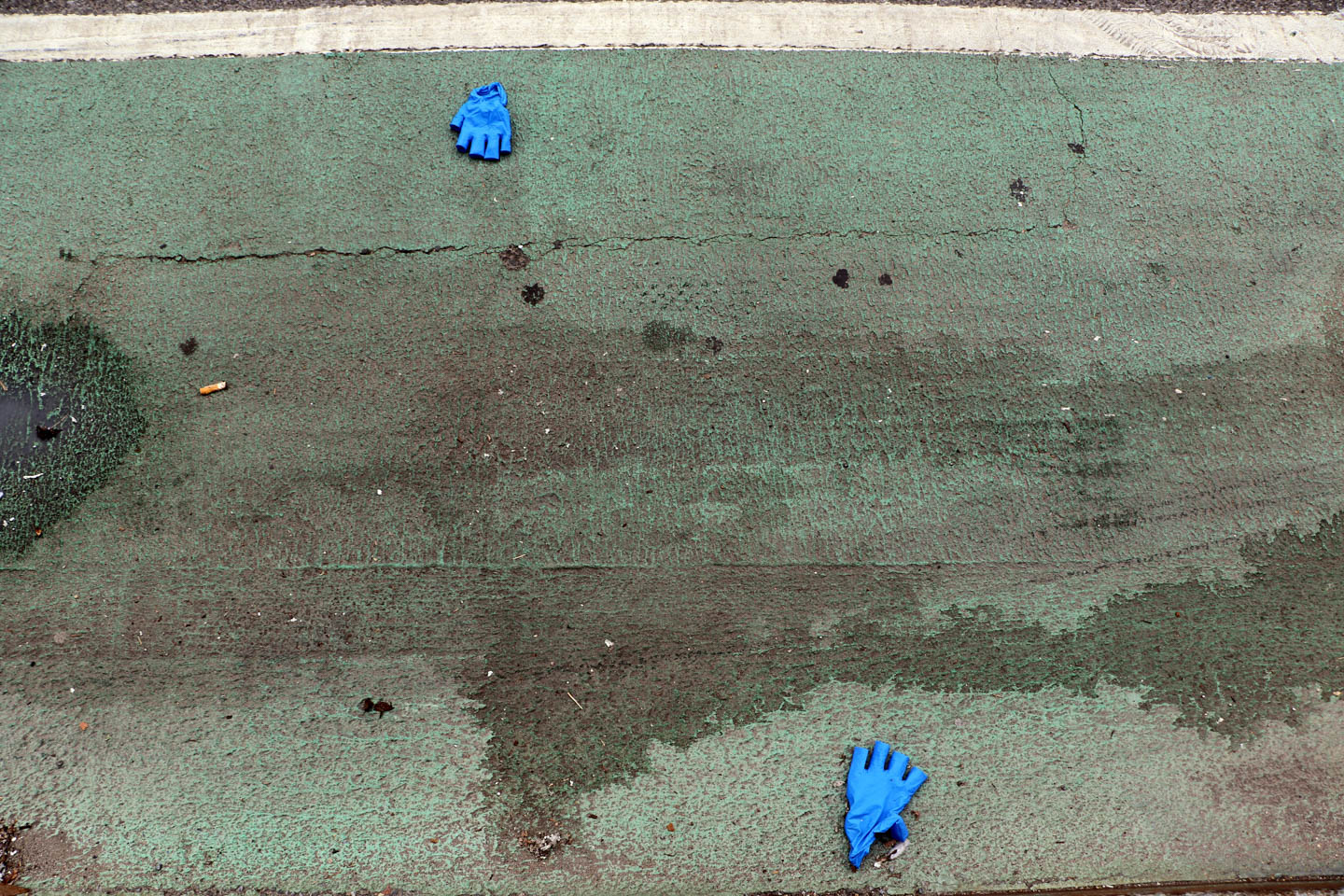 “As New York’s streets are swept clean of human activity, it’s the objects and signs left behind that become stand-ins for our collective presence,” Khayyat says. “Discarded waste, protective gear, handwritten signs, and shadows of the essential workforce—these are the new, commonplace sightings puncturing the ghostly void of a city on lockdown. Like forensic evidence, they point with urgency to larger and more chaotic undocumented worlds. I think of them on my way to replenish supplies and protective equipment for my own essential work.”