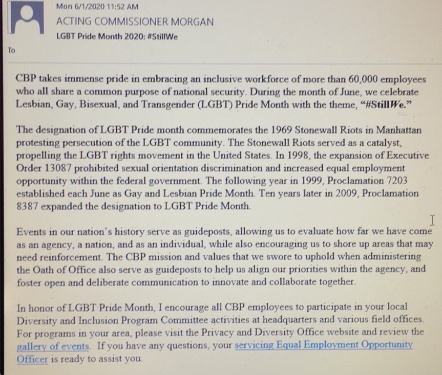 “CBP takes immense pride in embracing an inclusive workforce…. During the month of June, we celebrate Lesbian, Gay, Bisexual and Transgender (LGBT) Pride month with the theme, ‘#StillWe,’” the e-mail begins.