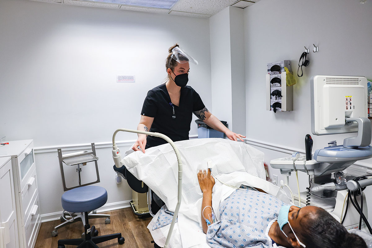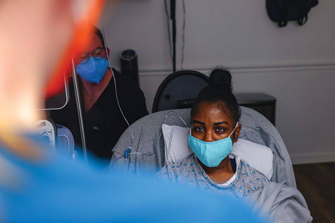 Scarlet (a pseudonym) is a young black mother in a gray sweatsuit, with straight hair that frames her face. “I don’t want to see,” she tells Dr. Villavicencio, opting for the sheet between her face and belly that shields her from watching the injection.