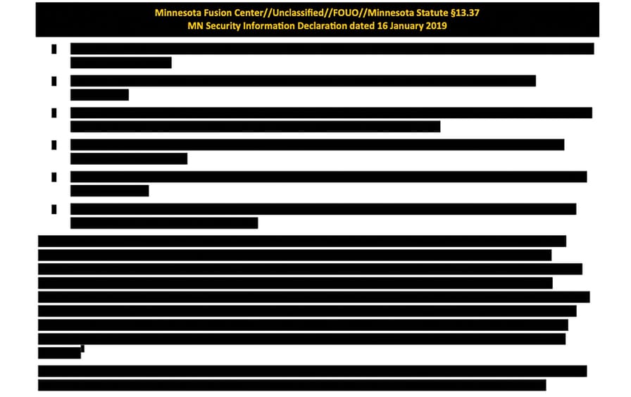 While I don’t have the complete reports, these titles seem to suggest that substantial resources have been dedicated to subjects unrelated to terrorism. That is not to say I didn’t request the complete reports; I did. But the fusion centers either refused to produce them, citing their sensitivity, or redacted them beyond all recognition. Consider the Minnesota Fusion Center, which declined to disclose the titles of any of its intelligence reports. It did, however, produce the underlying documents, the relevant contents of which were so thoroughly redacted that even the bullet points were blacked out.