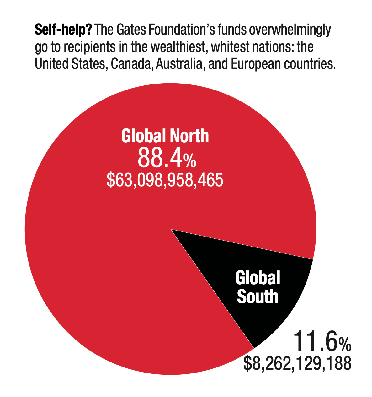 The Nation examined 30,000 charitable grants the foundation has awarded over the past two decades and found that more than 88 percent of the donations—$63 billion—have gone to recipients in the wealthiest, whitest nations, including the United States, Canada, Australia, and European countries.
