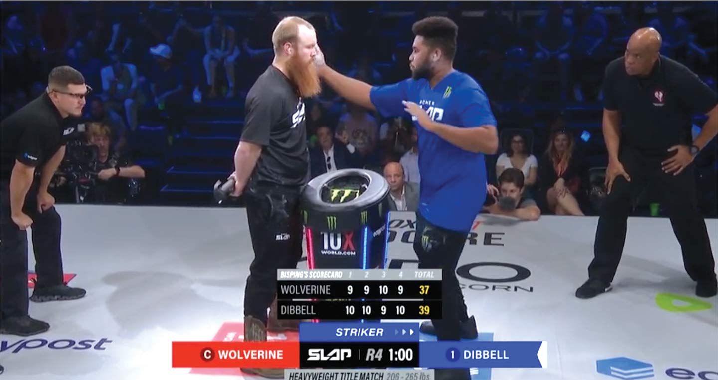 The matches are short, violent, and irritatingly well produced, as one fighter, after a painfully slow choreographed windup, slaps the other, who then has 30 seconds to regroup in time to slap back. Competitors have hokey stage names like Slap Jesus, tragic backstories, and a reliable complement of personal demons to exorcise. A single powerful slap often leads to a knockout—which is then replayed in ultra high-def slow motion, over and over again, so that you can see the facial flesh rippling and the disorientation setting in. Victorious fighters are ushered back to the Slap House, while losing fighters sometimes have to be attended to by a doctor before being carted off, perhaps to be rendered into glue.
