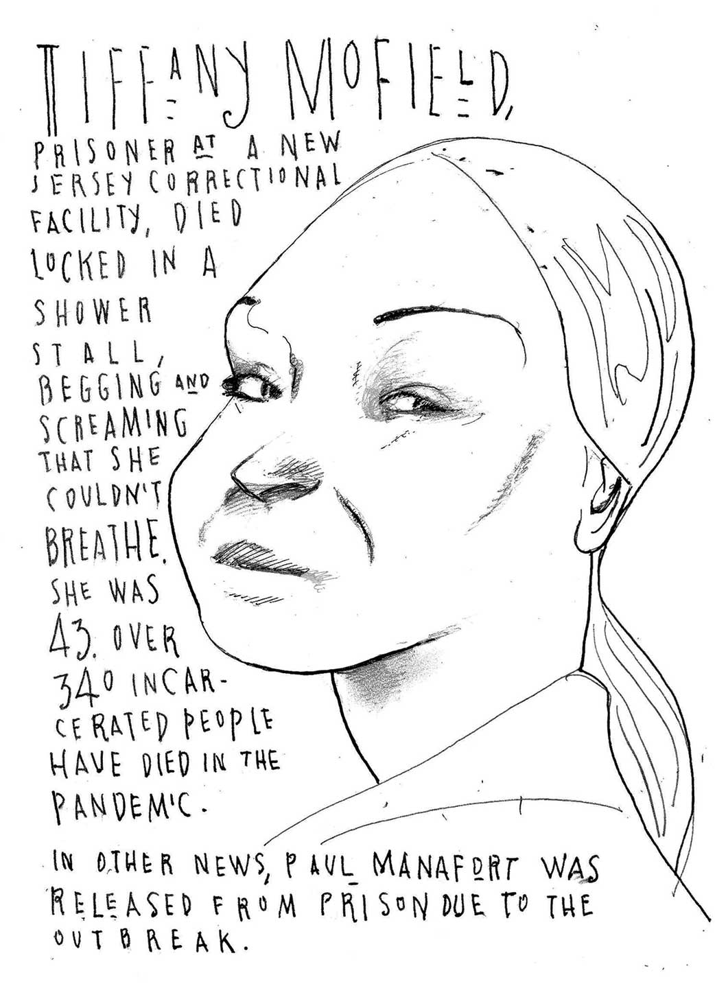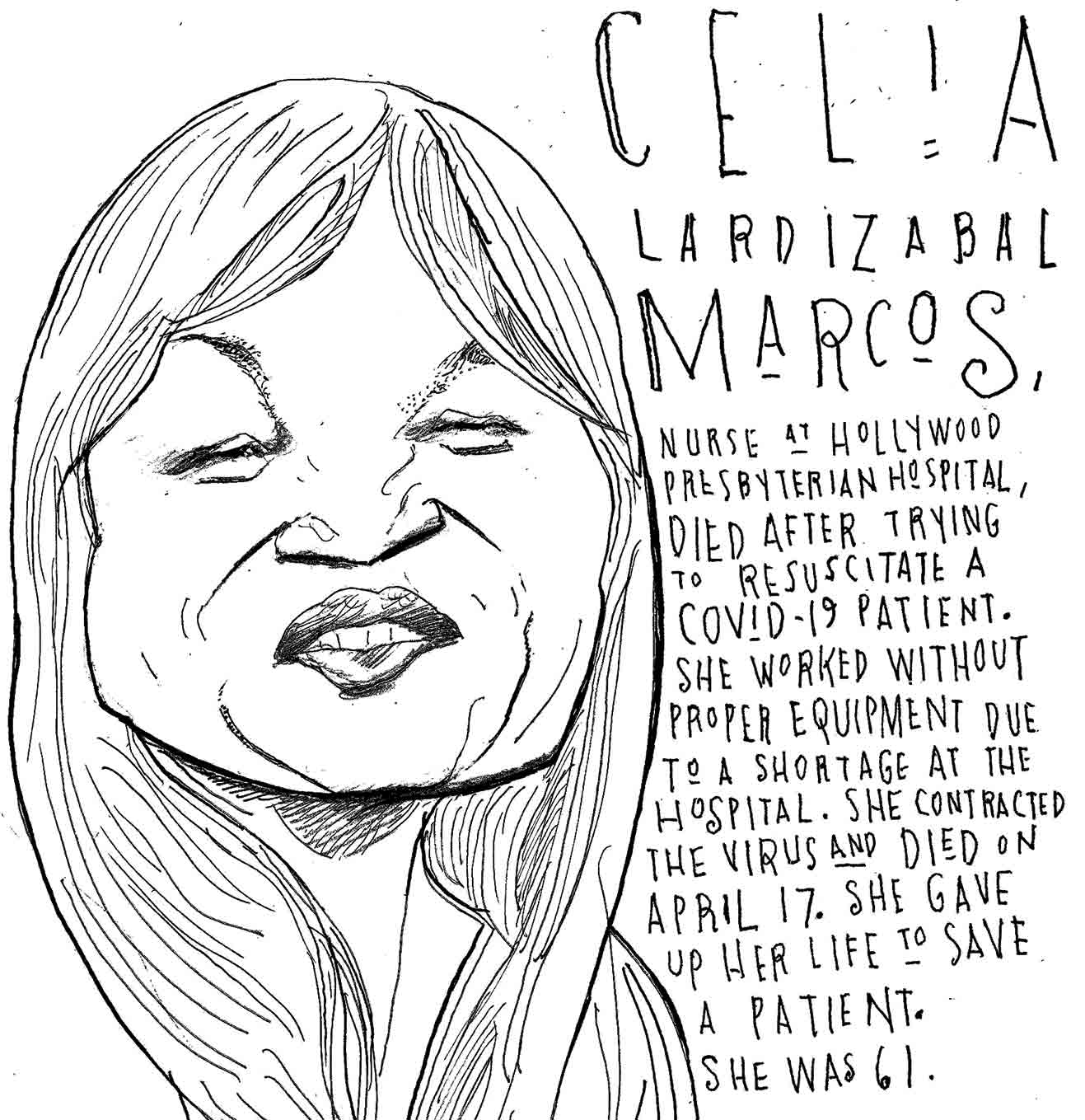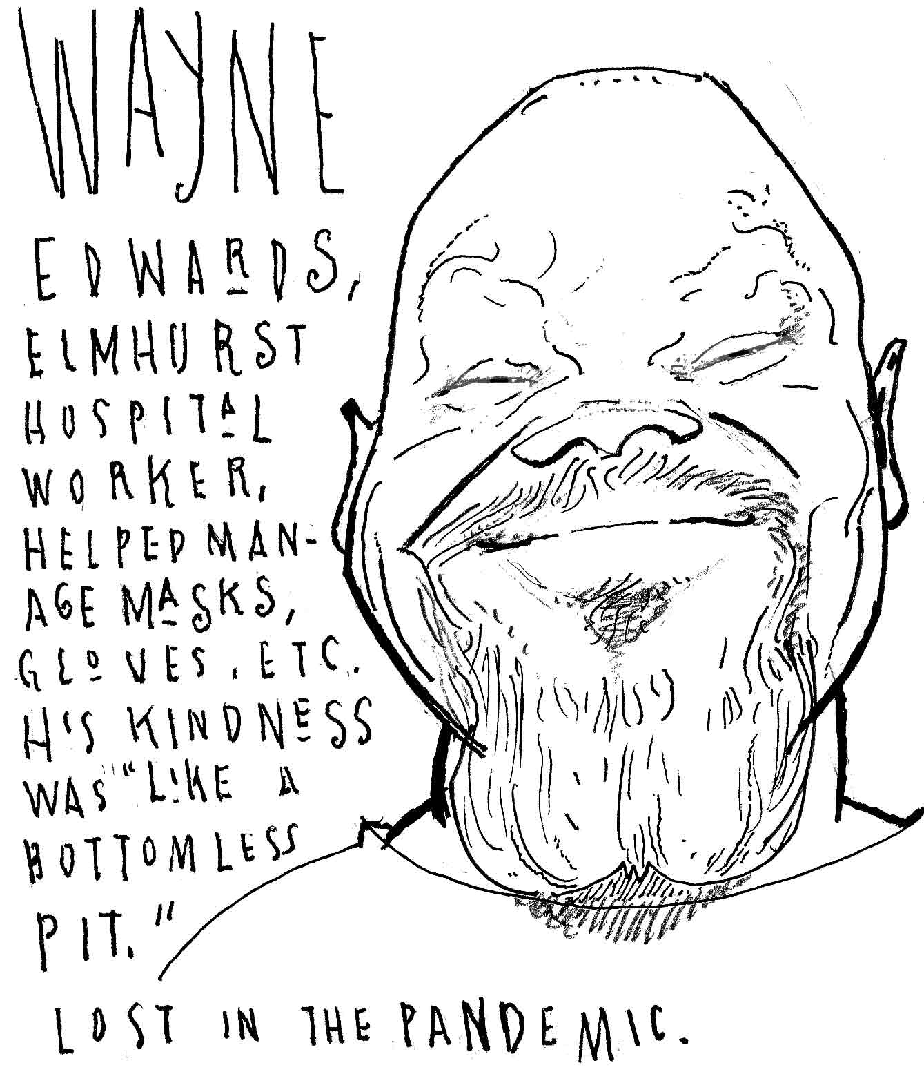 During this pandemic, I have found the losses to be overwhelming and numbing. I decided to use illustration to reflect on the lives abruptly ended by Covid-19. I’ve been posting my drawings on social media (Instagram: @sbrodner; Twitter: @stevebrodner). I found stories of workers, nursing home residents, and others. By drawing them, I discovered that through their eyes and expressions, we could perhaps sense their personalities. —Steve Brodner