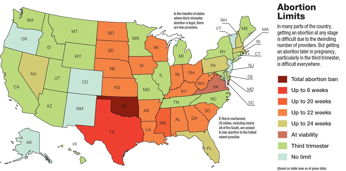 Less than two months after her abortion, Smith contacted me after finding my podcast, ACCESS. She sent an e-mail with the subject line “Abortion at 27 weeks” that detailed her story of agonizing delays and denials of care. In many parts of the country—particularly in the South and the Midwest—getting an abortion at any stage of pregnancy is difficult because of the dwindling number of abortion providers, the onerous legal restrictions, and other financial and logistical barriers. But getting an abortion later in pregnancy, particularly in the third trimester, is difficult everywhere. Twenty-two states have bans in effect that prohibit abortion starting between 20 and 24 weeks’ gestation, and 20 states impose a ban at viability, generally recognized as 24 weeks. When exceptions to these bans exist, they are often narrowly applied, and in the handful of states where third-trimester abortion is legal, there are few providers.