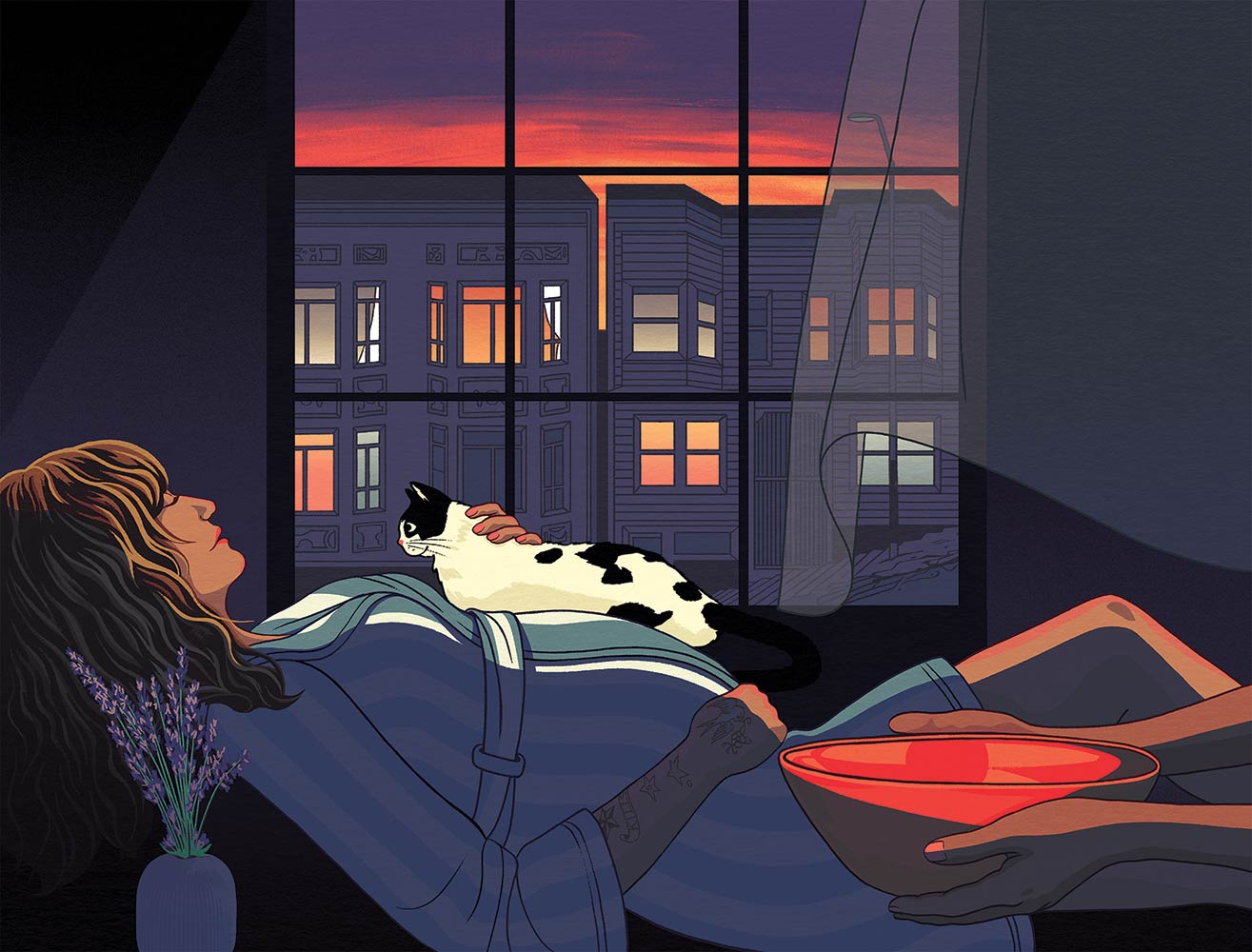 “My witch, Lulu Twilight, sends me a jar of honey, decorated with star anise and charmed with a fertility spell,” Tea writes. She is tasked with drinking the honey and making a “baby altar.” Later, receiving acupuncture, she reports, “I can feel my heart chakra open up as I lie back in the recliner. A spinning throb in my solar plexus.” It’s all got the feeling of a caper.