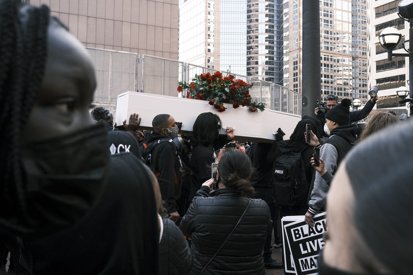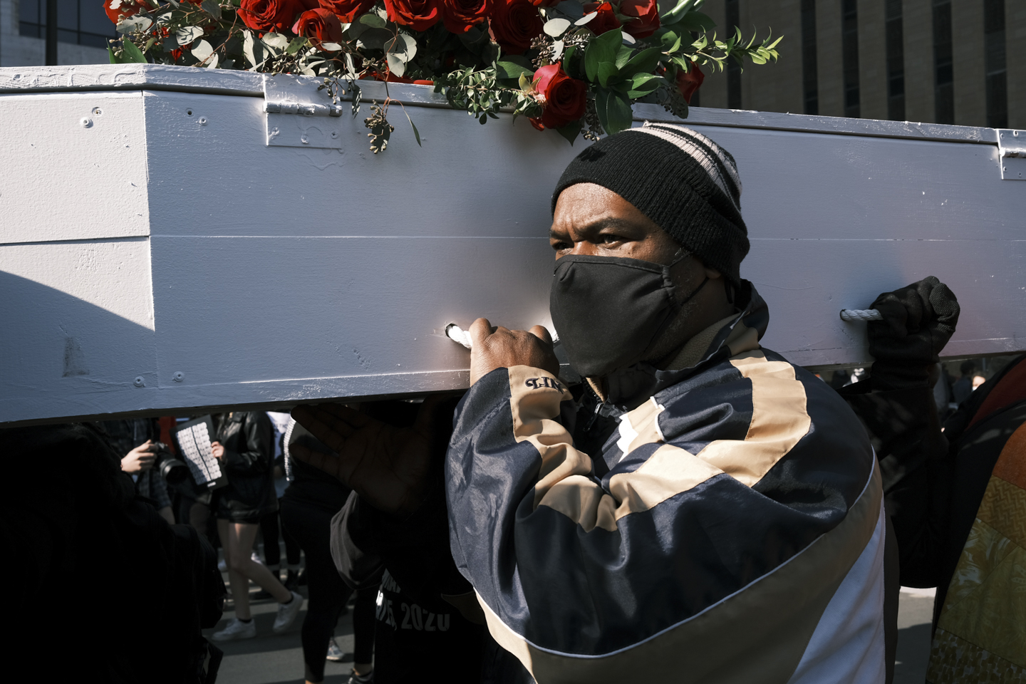 The day before jury selection began in early March, protesters in Minneapolis held a funeral in the streets. With police barricades as a backdrop, hundreds of people silently marched around the Government Center to honor Floyd and other victims of police violence.7