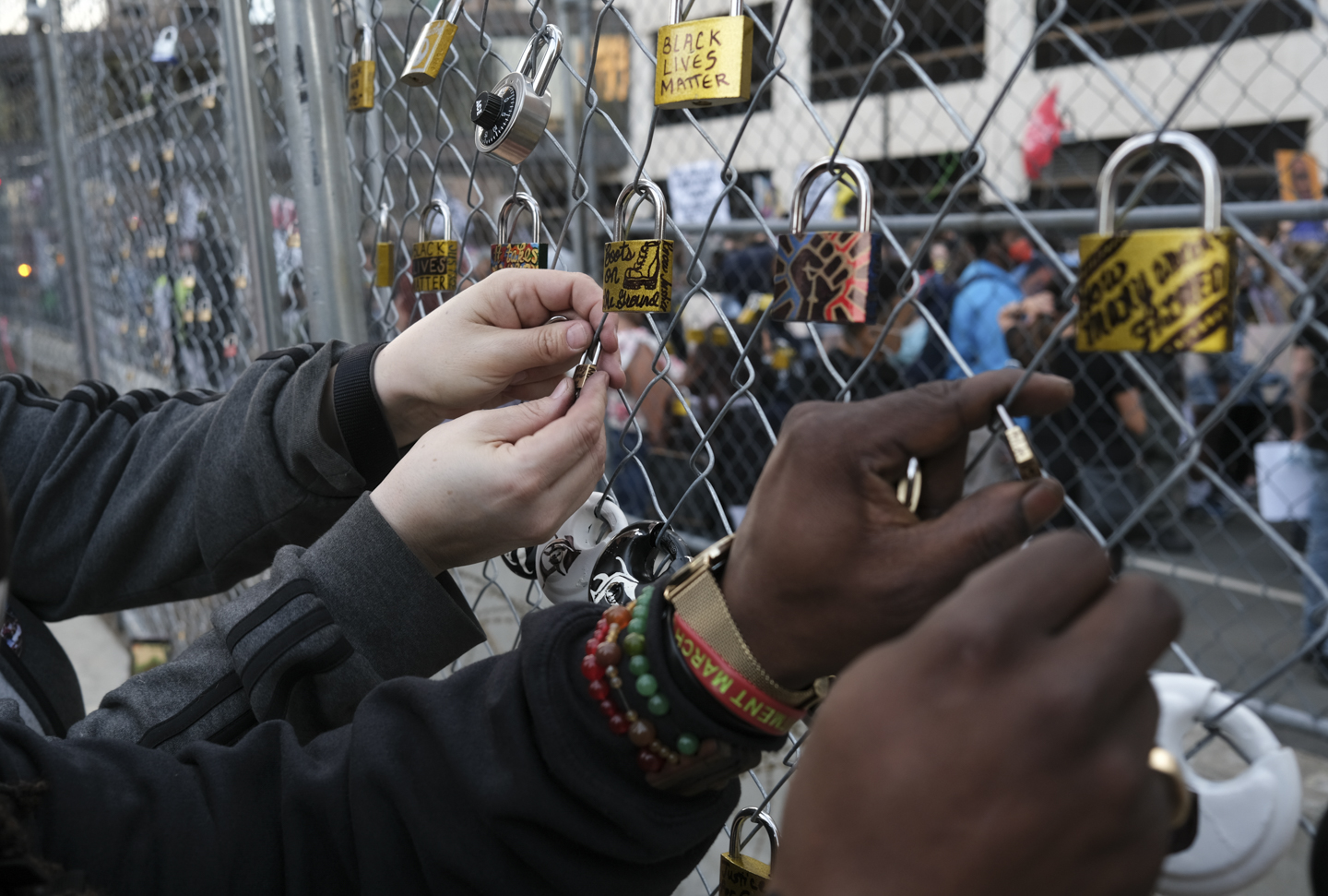 Outside the Hennepin County Government Center, protesters fixed padlocks to the fencing. On the locks, they’d written the names of police violence victims. George Floyd. Jamar Clark. Justin Teigen. Eric Garner. Police have repeatedly cut down the locks and removed signs from the fence. As of Monday, one of the remaining signs said: how do you spell murderer? mpd.9