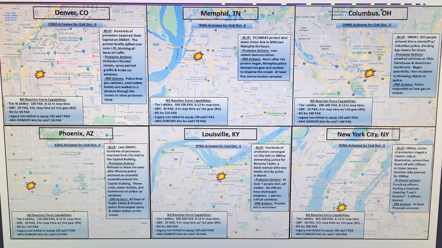 A situation report details “Protester Actions” and “National Guard Reaction Force Capabilities” in six cities: Denver, Memphis, Phoenix, Louisville, New York, and Columbus. Troop capacities (labeled “PAX” in the document) range from 100 to 500 Guard members in each state, but the document reveals that there’s enough riot gear (RG) for only a fraction of them.