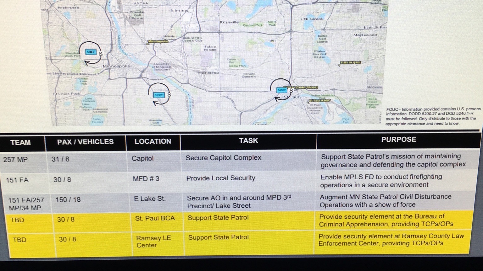 A document pertaining to the Minnesota National Guard, marked “For official use only” (FOUO), describes one operation’s purpose: “Augment MN State Patrol Civil Disturbance Operations with a show of force.” Other operations are variously described as providing security for law enforcement agencies, defending the state Capitol, and “maintaining governance.”