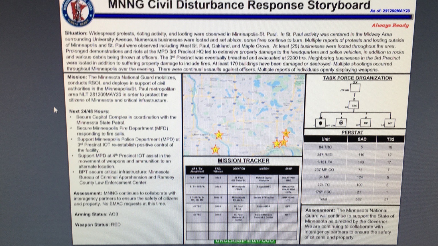 In addition to Minnesota, where a Minneapolis police officer killed George Floyd, the military is tracking uprisings in New York, Ohio, Colorado, Arizona, Tennessee, and Kentucky, according to a Defense Department situation report. Notably, only Minnesota has requested National Guard support. The documents were originally stored on an unclassified server but were subsequently elevated to a classified system. While the documents reveal significant National Guard force capabilities in each of those states, one Minnesota Guard member expressed concerns about the troops’ lack of training to respond to civil unrest.
