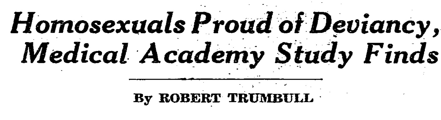 What’s more, the dreaded homosexuals seemed to be… OK with being gay. “Homosexuals Proud of Deviancy, Medical Study Finds,” another front-page story from 1964 lamented. Even more concerning, the study’s findings “were said to apply to homosexuals everywhere, not just in New York.”