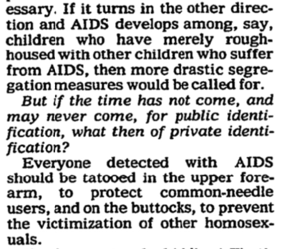 You had to be a kind of Kremlinologist of queerness to read between the lines of scores of Times obituaries, which bent every which way to avoid saying that someone had died of AIDS. The paper infamously allowed William F. Buckley Jr. to demand that people with AIDS be tattooed, like concentration camp victims, to mark them out from the rest of society.