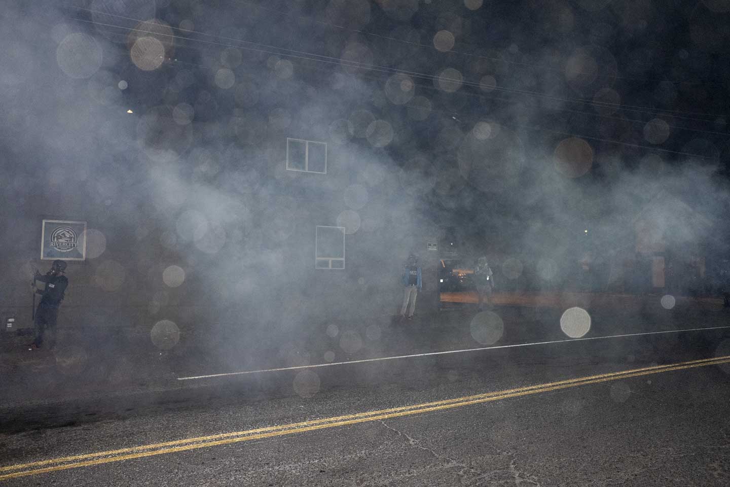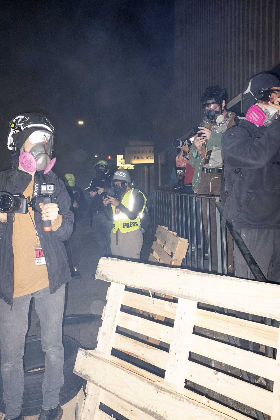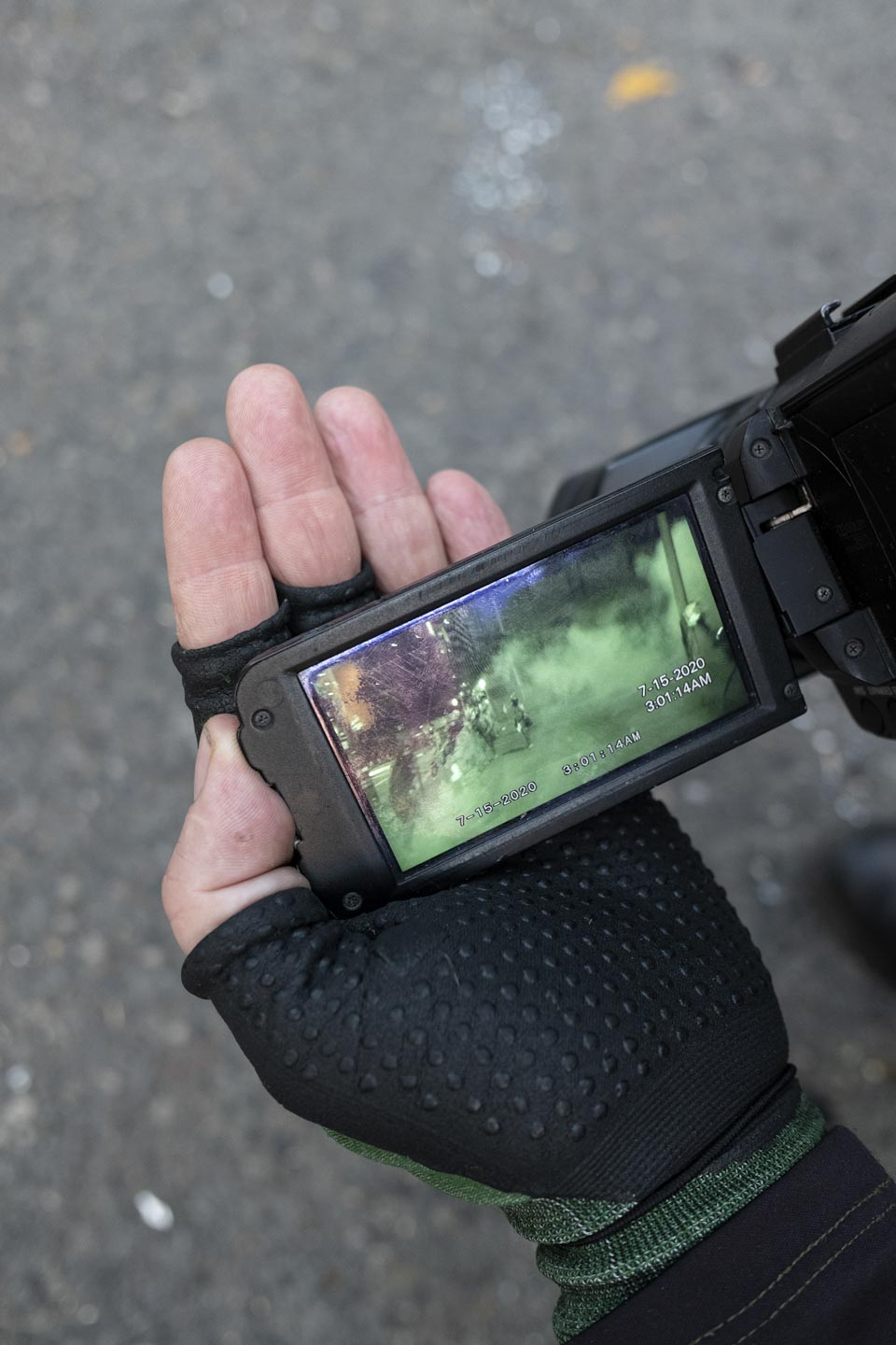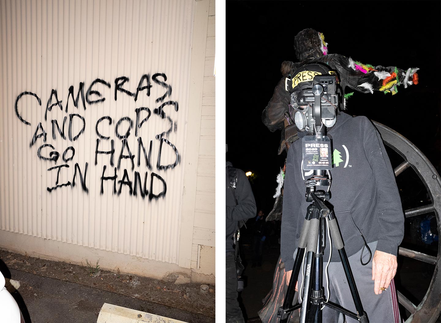 The arrival of federal police only intensified this: The population of photographers ballooned, and their nightmarish visuals of camo-clad agents taking aim at unarmed protesters were shared on social media and across the Internet. News crews often couldn’t get close enough to the action because of safety concerns, so a lot of the footage we saw from the summer’s pitched street battles was that of citizen participants, activist streamers, or local freelancers—a tangle of masked observers that made it hard to determine who was who. A cottage industry of semiprofessional streamer crews with names like Concrete Reporting and AssfaultPirates emerged, along with paranoia as word spread that the feds were using livestreams to identify protesters. Filmers that the protesters considered to have a conservative bias, or suspected of being police informants, were routinely set upon and ejected from demonstrations. Members of the press struggled to reconcile subjects’ privacy concerns with the demands of breaking news reporting. The visual nature of the protests combined with the sheer number of cameras contributed to a layering effect, as if every image were now a picture about how pictures were being made.