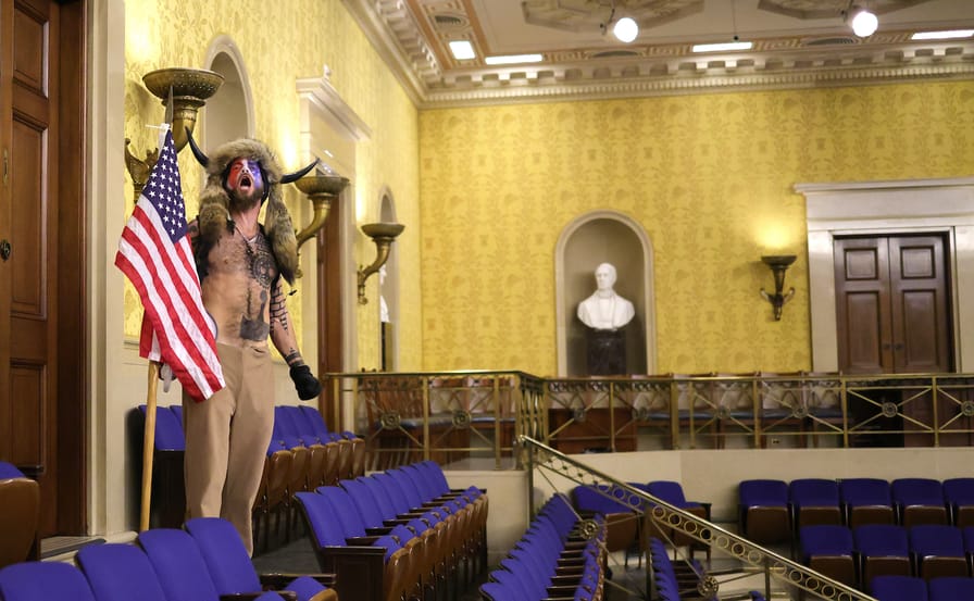 In some senses, Chansley’s “sartorial splendor” has been seized upon because it acts a symbol for the various transgressions of Trumpism. It also makes him an easy target of mockery: Jokes circulated about the fact that he still lived with his mother, or that the US Marshals Service was forced to make jailhouse accommodations for his all-organic diet; both true. These cracks escalated recently, when Chansley appeared on television, speaking from jail with CBS reporter Laurie Segall. Bare-faced and attired in considerably less-splendorous rags, he defended his shamanic beliefs, and claimed that he nobly thwarted attempts by rioters to steal muffins from the break room adjacent to “that sacred space, the Senate.” (Chansley’s mother, who also appeared in the CBS piece, also took some licks online.) In both these forms—bellowing in his full, furry ensemble, and the humbler prison apologia—Chansley has become a handy way of laughing off violent domestic terrorists as little more than a disorganized gaggle of, well, wackos and losers.